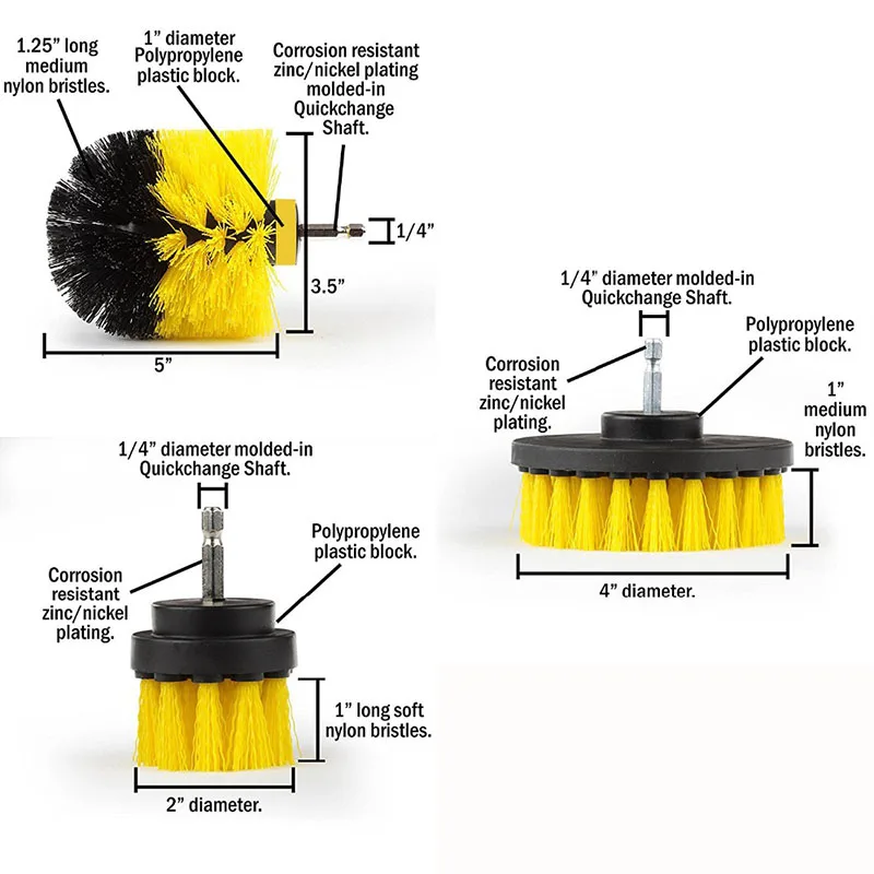 Этот комплект содержит нейлоновые силовые щетки средней жесткости, которые будут прикреплены к вашему любимому беспроводному сверлу.