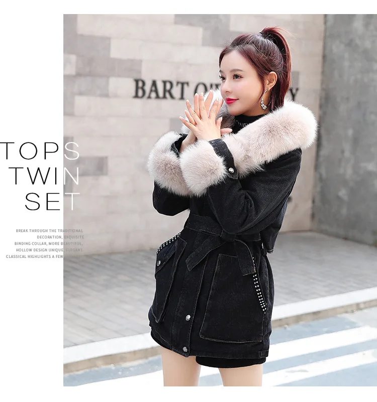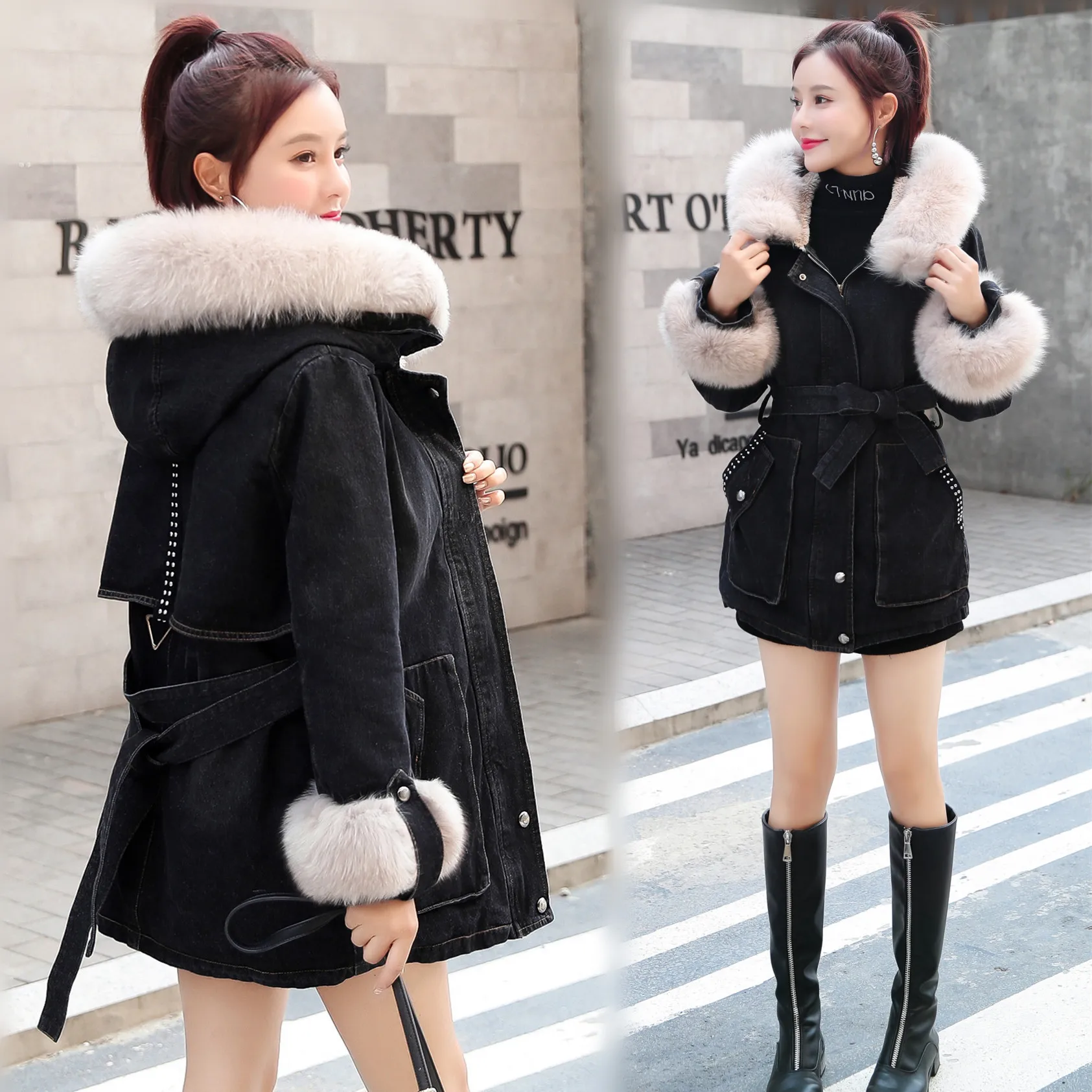 Джинсовая зимняя верхняя одежда, новинка, женские толстые парки из искусственного кашемира, свободное теплое пальто, Повседневная Корейская женская джинсовая куртка с капюшоном