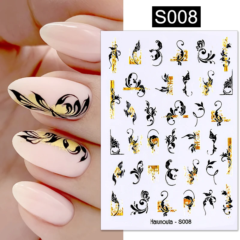 Harunouta золотые черные бронзовые листья дерево 3D наклейка для ногтей Геометрические линии буквы клейкая переводная наклейка сделай сам украшение для ногтей