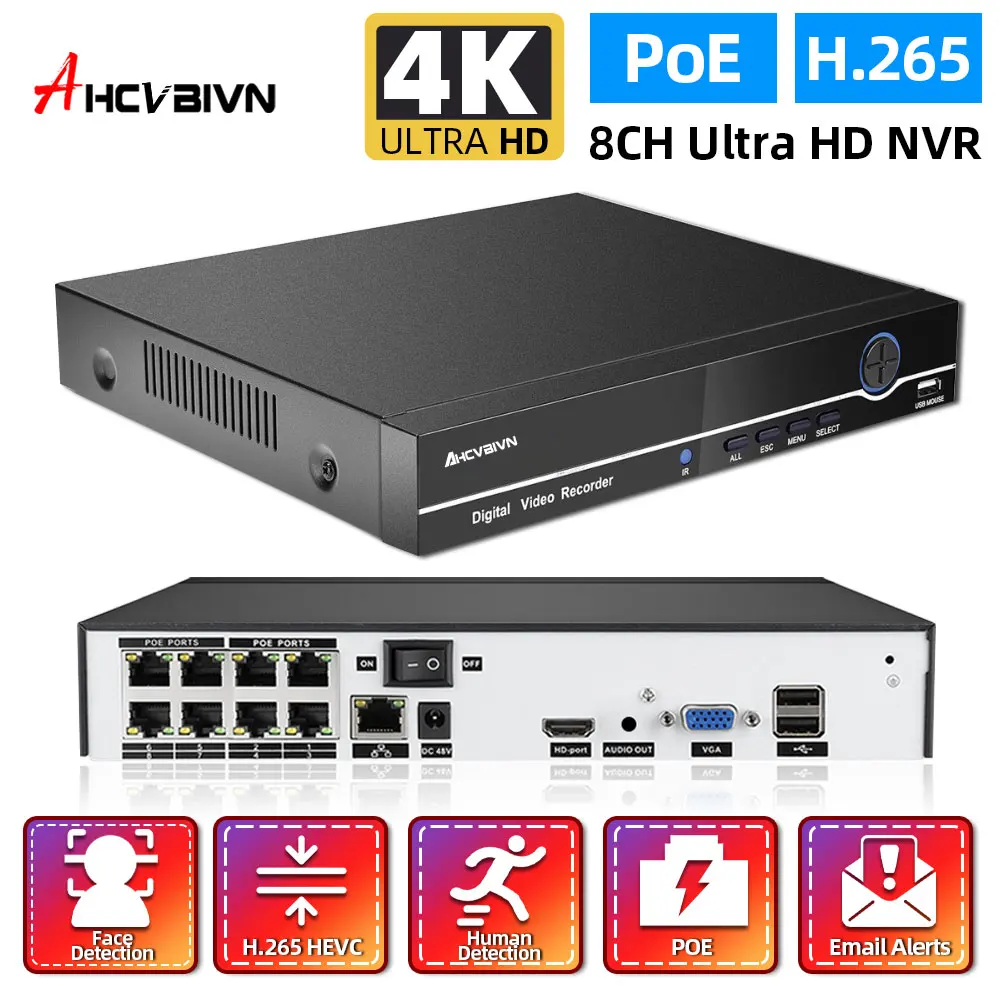 H.265 + 8CH 4K 8MP распознавание лица NVR IP Сетевая безопасность видео регистратор Обнаружение движения 25fps Система охранного видеонаблюдения POE NVR XMEye App P2P
