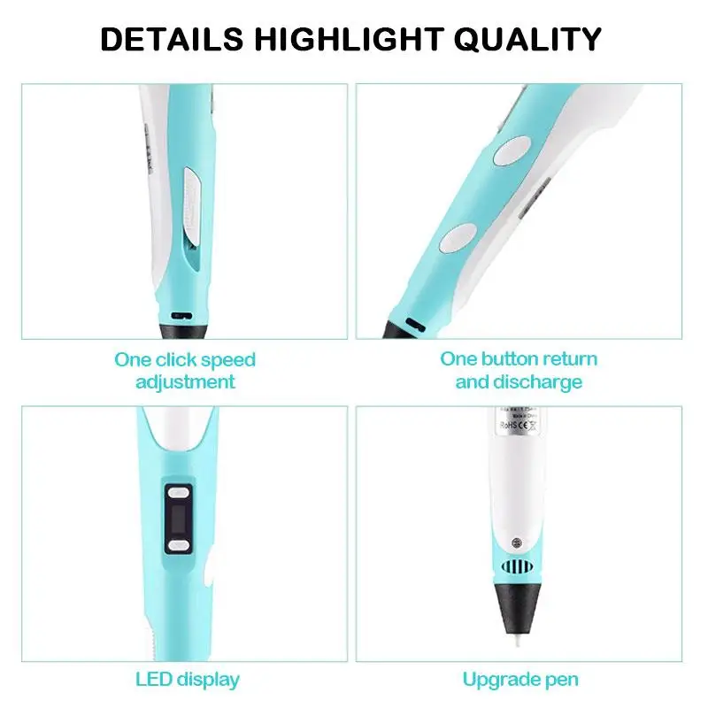 Экологически чистый материал: Изготовлен из ABS и PLA расходных материалов, эта печать является здоровой и экологически чистой.Удобный и быстрый: с ЖК-дисплеем вы можете смотреть на температуру и регулировать температуру в любое время и в любом месте, удобно и быстро.Хороший инструмент: это хороший инструмент для развития у своих детей неограниченного воображения.Применение: это изделие используется для детской печати и ручной работы.Идеальный подарок: Эта ручка для рисования может быть предоставлена детям в качестве подарка, и помочь им leran счастливо.Спецификация:Название продукта: 3D Ручка для печатиМатериал: АБС-пластикЦвет: розовый, синий, фиолетовый, желтыйТип: Великобритания, ЕС, СШАРазмер: 190x30x45 ммУпаковочный лист: