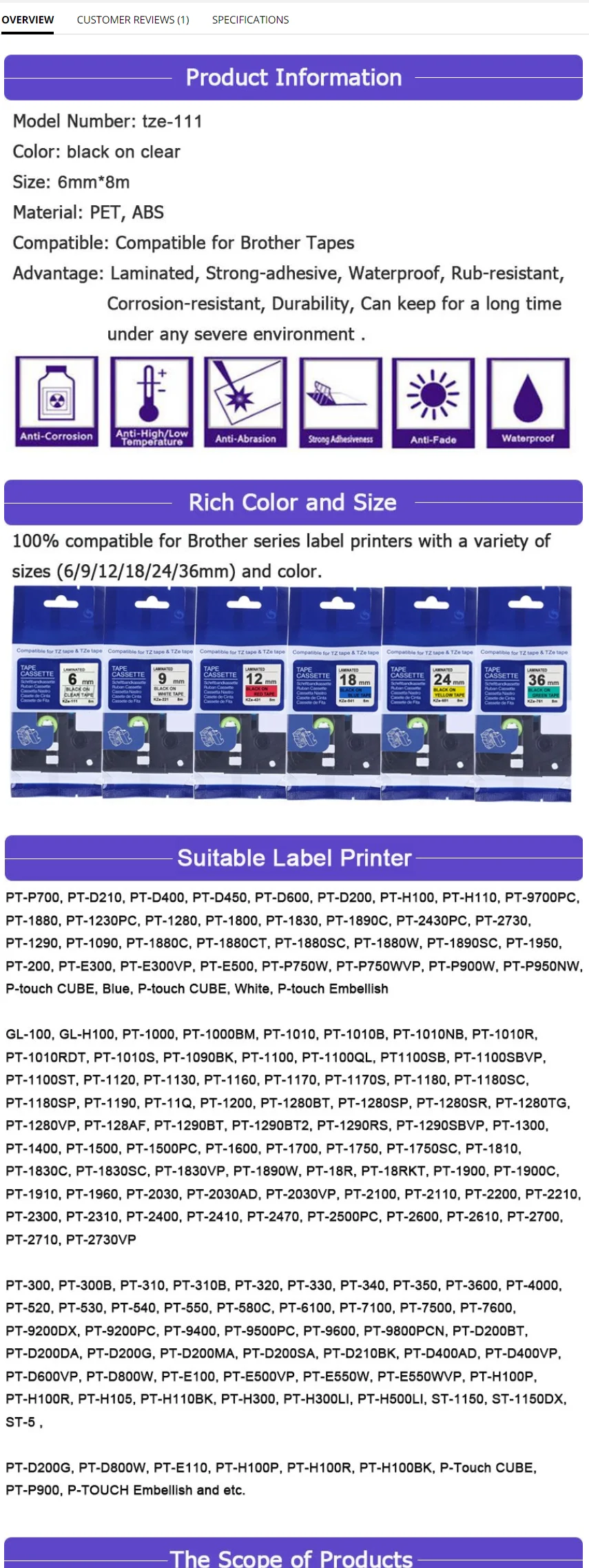 Tze 111 Tz111, черный на прозрачном ламинированном совместимом с P touch, фотомагнитная лента диаметром 6 мм, tze111, картридж для кассеты