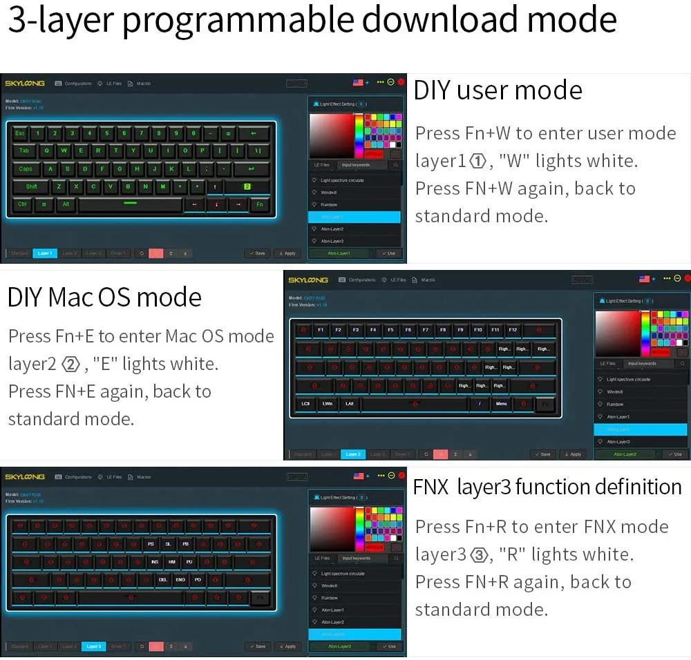 SKYLOONG GK64/SK64-это портативная механическая мини-клавиатура размера, разработанная с подсветкой DIY и высококачественной подвеской. Это лучше, чем возможность использования различных языков раскладка клавиатуры, в том числе четырёхъядерный 64-разрядный процессор ключ-макет, состоит в том, чтобы обеспечить вам комфортное родной язык клавиатуры. Специальные макроэлементы управления могут стать настоящим благом в играх, что избавит вас от проблем с вводом длинных строк команд каждый раз, когда вы хотите выполнить Общее действие. Полностью программируемые клавиши с функцией On-The-Fly Macro Recording, все клавиши SKYLOONG GK64/SK64, Механическая игровая клавиатура программируются с функцией on-the-fly macro recording, включая одиночные клавиши и комбинационные клавиши. Меньше, но намного мощнее. Упрощенная игра позволяет всегда быть на шаг впереди. В каких-либо чехол, независимо от того, что вы хотите от клавиатуры, вы можете найти механическая клавиатура, способный сделать это реальностью с большим количеством веса. Компактный размер со съемным usb-кабелем с небольшим размером ноги, GK64/SK64 действительно портативный для игр на ходу. Плетеный usb-кабель может быть отсоединен и аккуратно уложен для удобства переноски на ЛВС-вечеринки и турниры. ✅【RGB подсветка 】: 16,8 миллионов цветовых комбинаций, несколько режимов подсветки (Аврора, пульсация, музыка, радуга, волны, градиент, ветряная мельница, спектр и одиночный светильник), никаких драйверов не требуется. Plug & Play небольшой форм-фактор клавиатуры ✅【Оптические переключатели gateron 】 оптические переключатели gateron можно использовать по желанию и заменять другими переключателями. Клавиатура с горячей заменой не требует возврата к переключателям для припоя/демонтажа. (Горячая замена только с оптическими переключателями) ✅【ABS Doubleshot keycaps】gk64/SK64 idoubleshot abs фондовые колпачки, меняйте их по желанию благодаря keypuller, включенному в посылка. ✅【Макросъемка и другие функции 】 запись макросов через программное обеспечение, настройка расширенных функций, Персонализация функциональных клавиш... Полный режим защиты от Ghosting (NKRO). ✅【Совместимость с Mac и Windows】: Совместимость с Windows 10, Win 8, Win 7, Win Vista, Windows XP и Mac OS, GK64/SK64 поставляется с кабелем типа C для Type-a длиной 60 дюймов. Клавиатура адаптирована для всех условий окружающей среды, домашнего и офисного использования, небольшой форм-фактор для крошечных пространств. Дополнительные функции и светодиодный настройки подсветки, пожалуйста, загрузите или обновите драйвер из следующего Веб-сайт: http://www.jikedingzhi.com