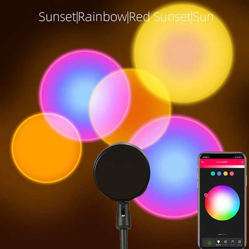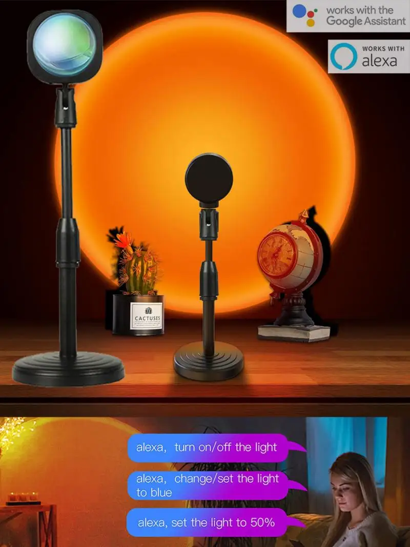 TUYA WiFI светодиодный Заход Солнца Проекционные Огни, эти огни проектируют удивительные круговые огни на стенах, потолке и полу. Он может управляться через приложение «Мобильный телефон», управляемое прикрепленным пультом дистанционного управления, может управляться голосом (Alexa, Google Assistant), или может быть приурочен, и может быть связан с другими устройствами для создания умных сцен.