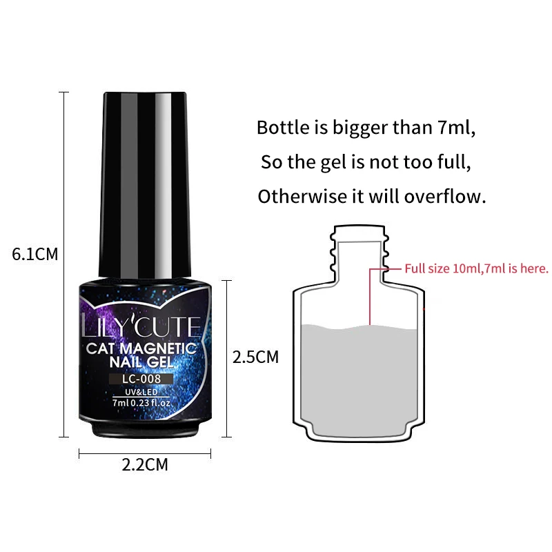 Спецификация:Бренд: LILYCUTEТип: Гель-лакТаблица цветов: как показано на фотографияхКоличество: 1 бутылкаДлительный период: около 15 днейЭффект: магнитный гель для кошекПодходящая лампа: УФ-лампа или светодиодный светильникПосылка:Магнитный гель LILYCUTE для кошек 7 млПочему выбирают наш лак для ногтей?Он изготовлен из здоровых, экологически чистых, не ядовитых, резких химических материалов.Он быстро сохнет с любым УФ-светильник.Длительный срок службы не менее 2-3 недель, фантастические и супер яркие ногти для вас.Этот Гель-лак для ногтей легко наносится и впитывается.Позвольте вам профессиональный или домашний дизайн ногтей.Профессиональный подарок для ногтей для себя или вашей подруги.Как использовать наш лак для ногтей?Шаг 1. Очистите ногти, затем обрежьте поверхность ногтей как обычный процесс маникюра.Шаг 2. Полностью встряхните Гель-лак, он может сделать Гель-лак сбалансированным. (ВАЖНО)Шаг 3. Сначала нанесите базовый гель, который может сделать Гель-лак длительным, вылечите УФ-лампой или светодиодный лампой.(Необходимо)Шаг 4. Нанесите черный УФ-гель непосредственно, вылечите УФ-лампой в течение 2 минут или вылечите светодиодный светильник в течение 60 секунд.Шаг 5. Нанесите кошачий УФ Магнитный Гель-лак, не вылечивайте и не кладите магнит на ногти в течение 10-15 секунд, чтобы получить кошачий меганетический эффект, А затем немедленно вылечите УФ-лампой в течение 2 минут или вылечите светодиодный светильник в течение 60 секунд.Шаг 6. Покрытие без протирания, излечивается УФ-лампой или светодиодный лампой.Как удалить наш УФ-гель для ногтей?1. Нанесите поверхность ногтя.2. Нанесите салфетки для ногтей около 7-10 минут.3. Нанесите средство для удаления лишнего геля.4. Все удалены.5. Нанесите Масло для кутикулы ногтей и мягко массируйте его.Деликатные советы:1. Избегайте контакта с кожей. Если возникают покраснения или другие признаки нежелательной реакции, немедленно прекратите использование.2. Плотно закрываются. Держите подальше от солнечного света. Хранить в недоступном для детей месте.Примечание:Пожалуйста, избегайте контакта с кожей. В чехол несчастных случаев или в том случае, если вы чувствуете себя плохо, немедленно обратитесь к врачу (показать на этикетке в тех случаях, когда это возможно).