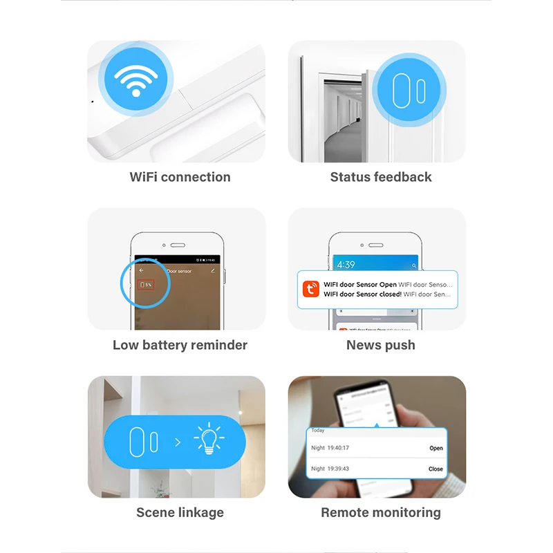 Никаких сложных инструментов для установки не требуется. Датчик может быть установлен с двухсторонней клейкой лентой или винтами (в комплекте) всего за несколько шагов, И загрузите приложение «tuya» или «Smart Life» из магазина GooglePlay или app Store, чтобы добавить устройство для обнаружения состояния вашей двери/окна.