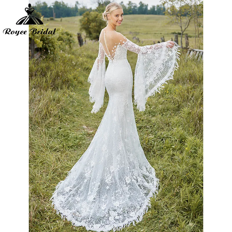 Великолепное свадебное платье-русалка в стиле бохо с длинным Расклешенным рукавом иллюзионное платье с глубоким V-образным вырезом со шлейфом Свадебное платье для невесты Vestidos De Noiva Roycebridal