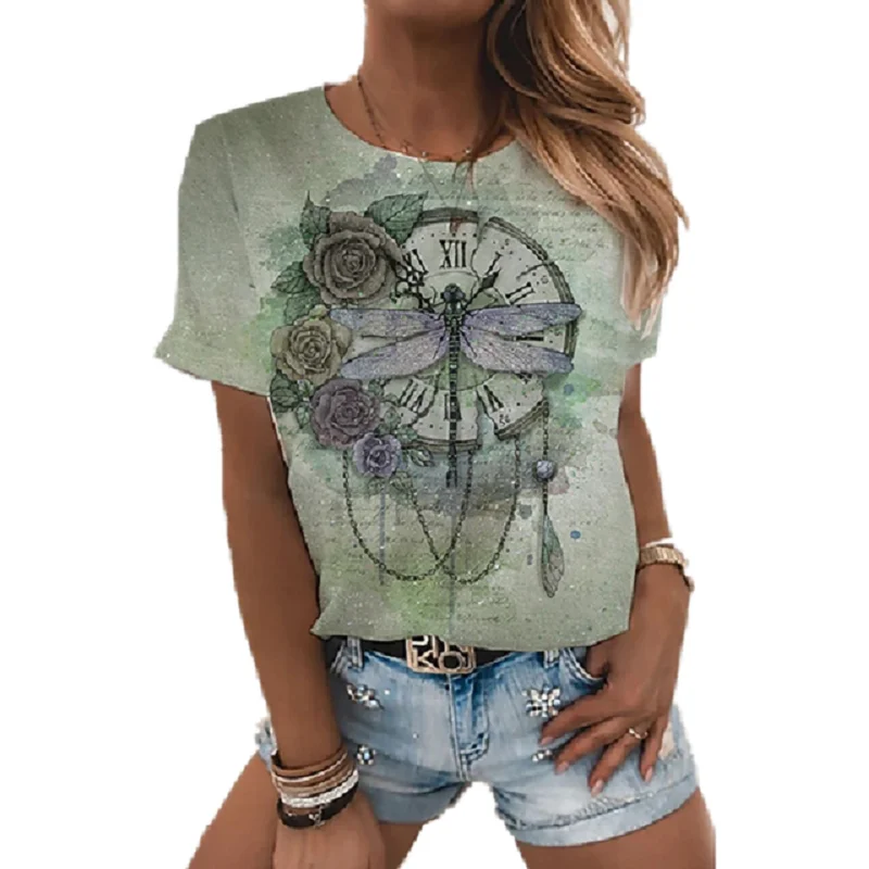 Модная женская футболка с круглым вырезом и коротким рукавом, красочная футболка с 3D-принтом стрекозы, летний городской тренд, элегантная женская