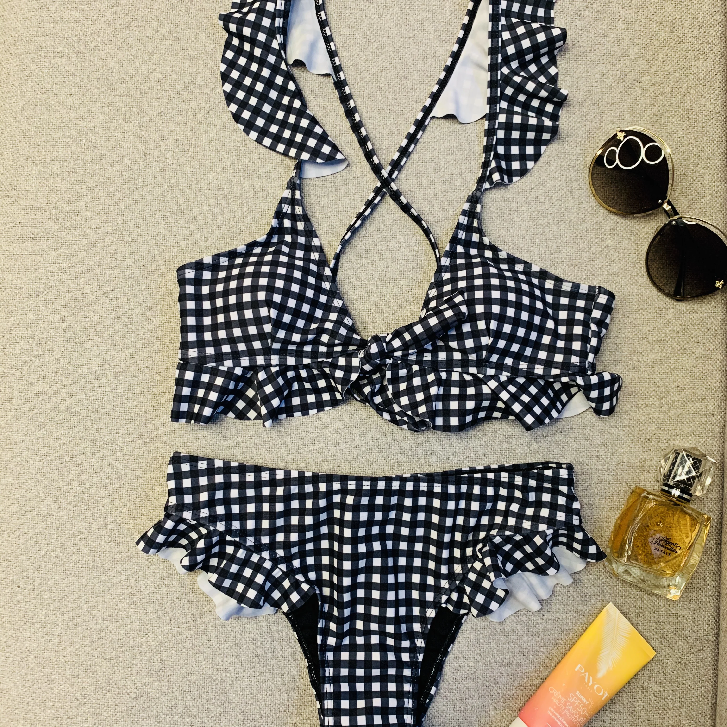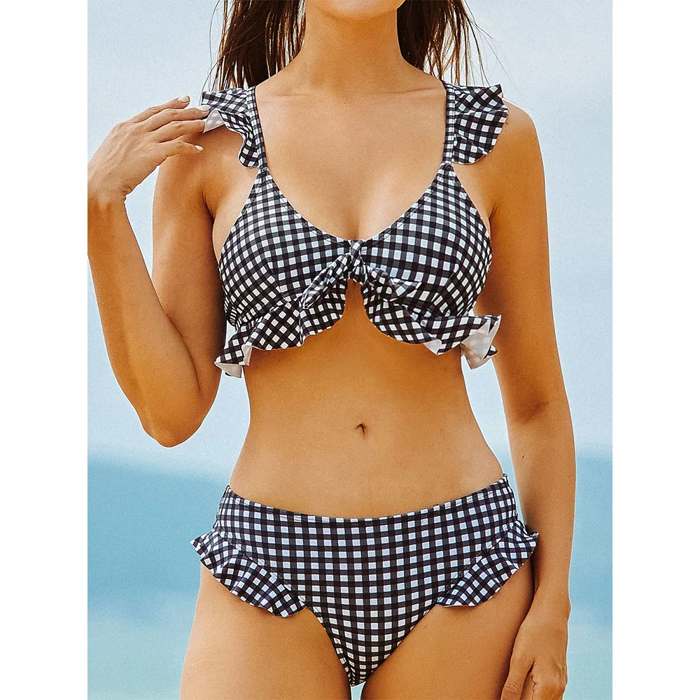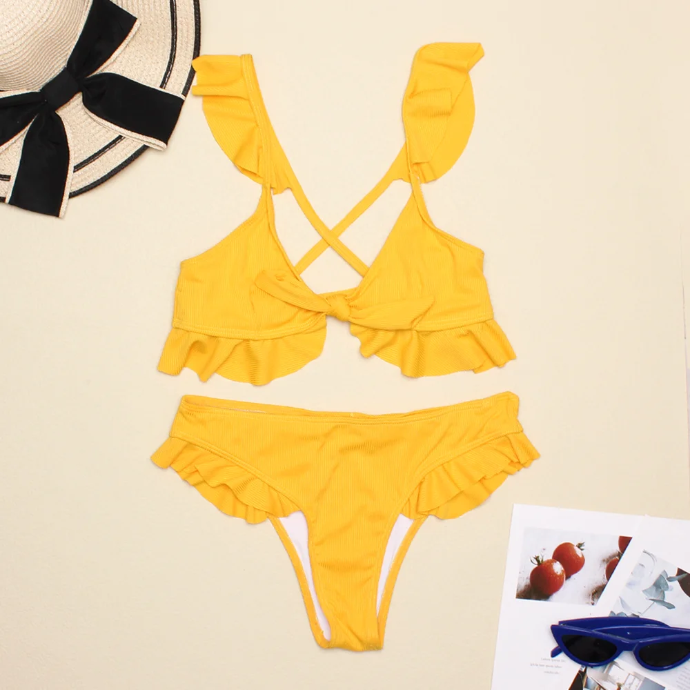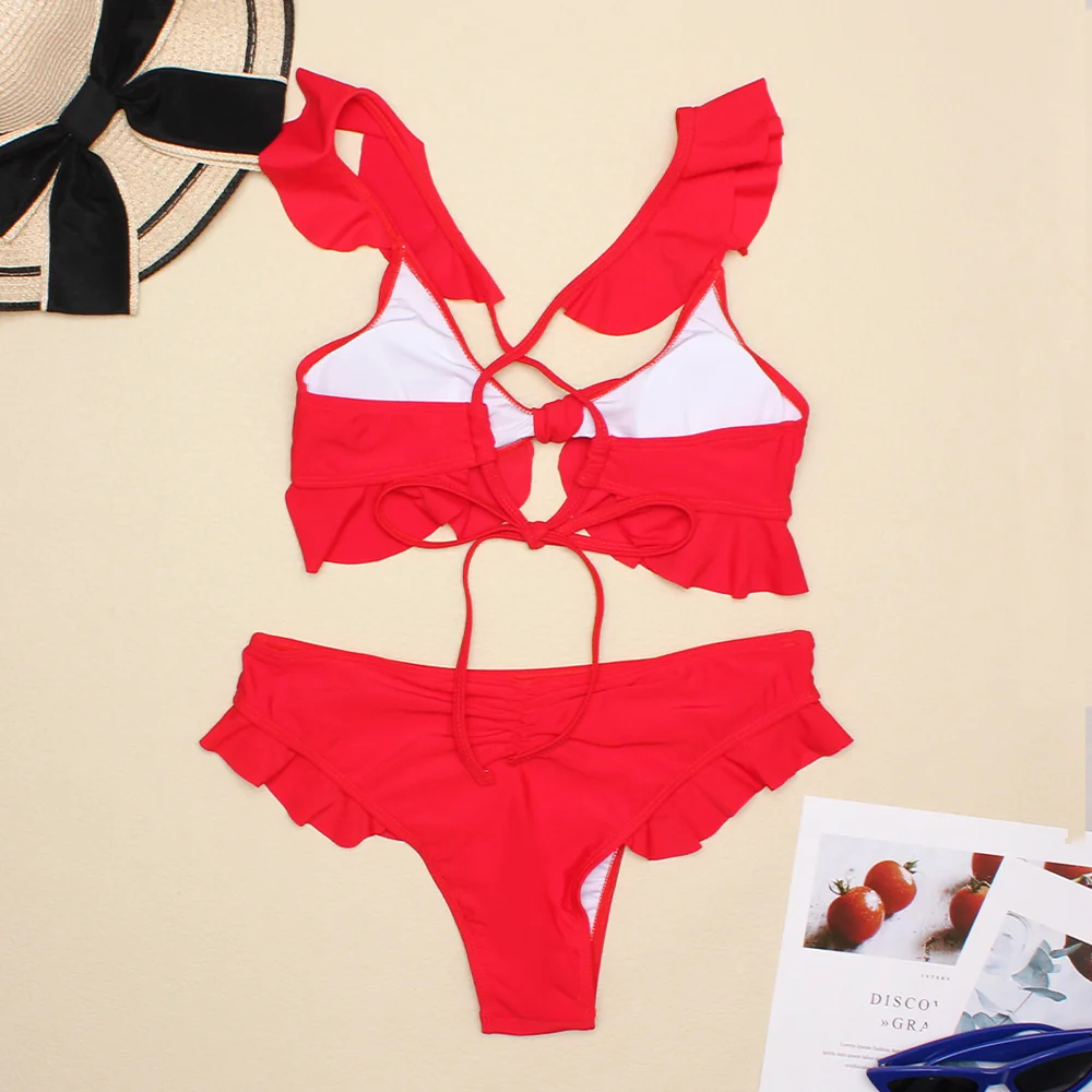 Купальник Gossina на шнуровке с оборками, женский купальник, сексуальное Бандажное бикини с V-образным вырезом, пляжный купальный костюм, женское бикини из двух предметов