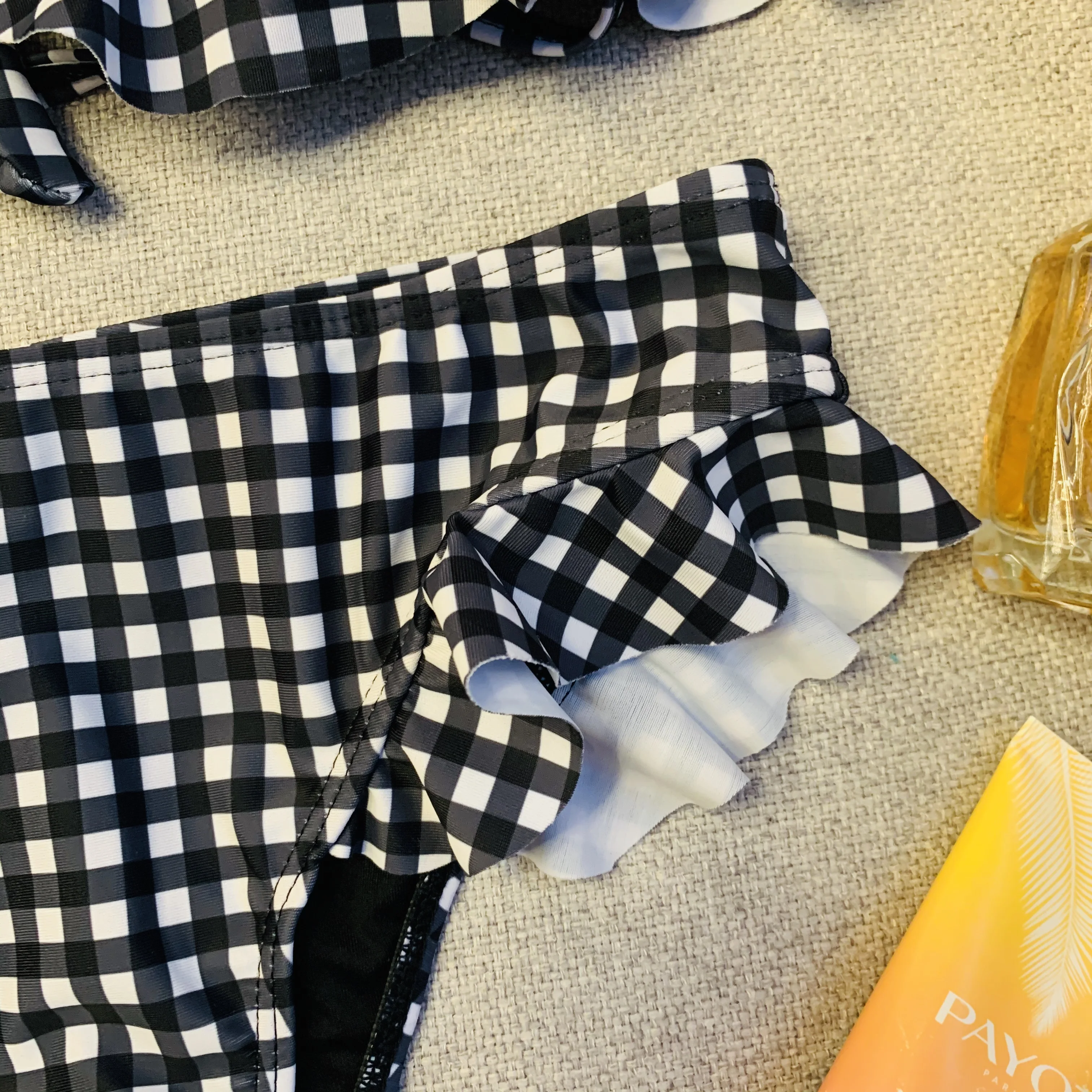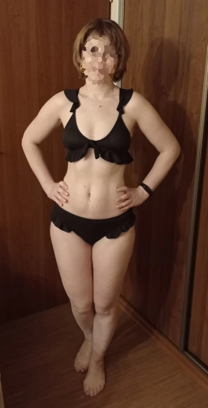На 90-65-90 (75С) размер S подошел хорошо, но в плавках сидит очень плотно. Это фактический 42 размер, не больше. Лиф на третий размер сел комфортно. Купальник декорирован воланами, вшитыми в бретели лифа и в проймы на бедрах. Лиф на шнуровке, она отлично регулирует объем и на шее и по спинке. Сзади сидит крест-накрест. Шнуровка очень длинная, я бы даже немного укоротила. Внутри лифа есть съемными вкладышами Плавки средней посадки, сзади немного присобраны сверху по центру. Есть подкладка в виде тонкой черной сеточки. Такая же подкладка и в лифе. Материал стандартный - 85% ПЭ и 15% спандекс. Исполнение фабричное, недочетов не было.