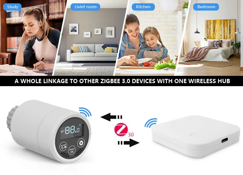 1. Термостат привода радиатора Smart Tuya ZigBee: Новый мини-дизайн с простым и четким ЖК-экраном на корпусе, термостат радиатора с ЖК-дисплеем и двумя секциями батарей, который является специальным клапаном, использующим вместе с нагревательным радиатором. Искусственно устанавливаемая температура в помещении, В основном используется в напольной системе отопления для контроля закрытия и открытия трубы.