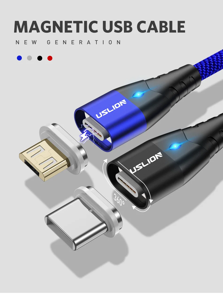 Магнитный кабель USLION Micro USBType-C, для iPhone, Samsung, Xiaom...