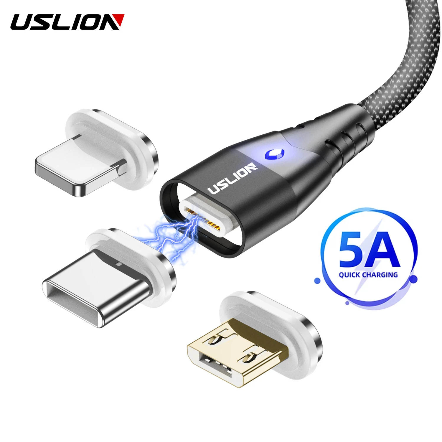 Магнитный кабель USLION 5A Micro USB для передачи данных на телефон, магнитное зарядное устройство типа C, быстрая зарядка для iPhone 12 Pro Max 13 Samsung Xiaomi