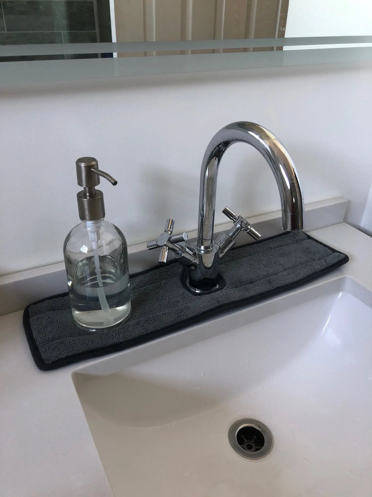 > Новый абсорбирующий коврик для смесителя разработан с пряжкой, и кнопка может легко блокировать абсорбирующую прокладку, так что она не будет легко увезена или потеряна детьми.> Впитывающая подставка для кухонного смесителя изготовлена из микрофибры, которая обладает высокой водопоглощающей способностью. Он пушистый, гибкий, устойчивый к морщинам, износостойкий и мягкий на ощупь. Он очень подходит для использования в кухнях и ванных комнатах.> Впитывающие подушечки очень подходят для предотвращения попадания воды на кухонные и ванные столешницы. Нет необходимости протирать поверхность раковины после использования крана. Прост в использовании и чистке.> Анти-износ дизайн окантовки, каждая сторона плотно инкапсулирована, не легко носить, очень подходит для длительного использования.> Подходит для большинства кранов, он впитывает влагу, имеет обертку вокруг конструкции, которая очень подходит для окружающих кран, и очень подходит для сохранения поверхности раковины чистой и сухой.> Подходит для большинства кранов, и достаточно для вашей кухни, ванной комнаты и RV.