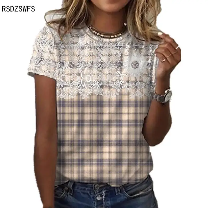 Женская клетчатая футболка в полоску, Повседневная Свободная футболка с коротким рукавом, 2021