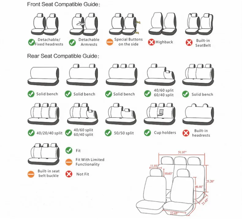 Особенности1. Универсальное применение подходит практически для всех сидений (автомобили, грузовики, фургоны и внедорожники)2. Помогает защитить хорошее сиденье или замаскировать старое3, подушка безопасности совместима4, легко установить