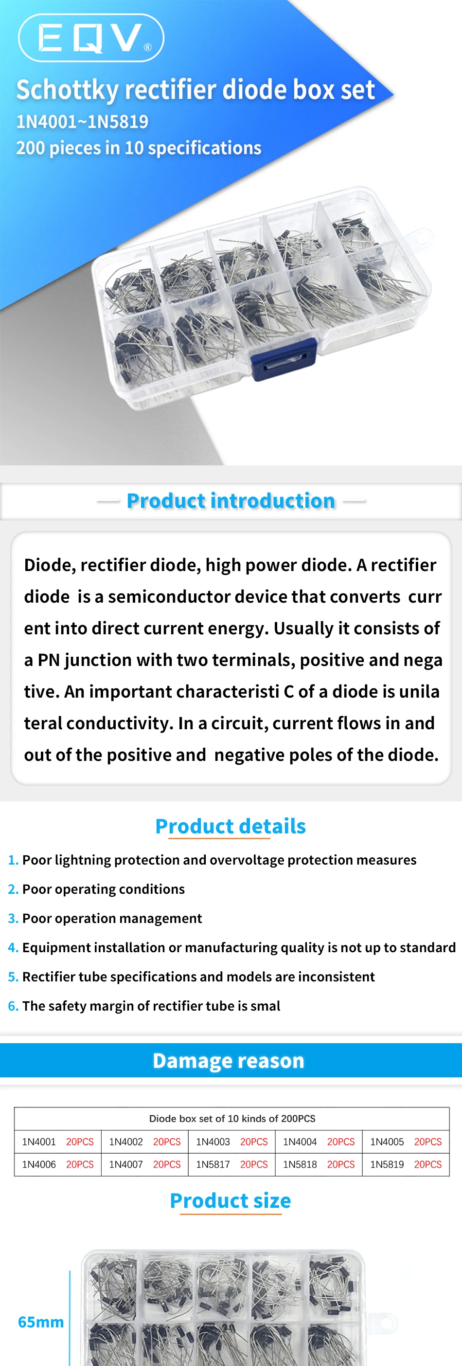 200 шт., 10 значений, выпрямительный диод, набор в ассортименте, 1N4001, 1N4002, 1N4003, 1N4004, 1N4005, 1N4006, 1N4007, 1N5817, 1N5818, 1N5819 + коробка