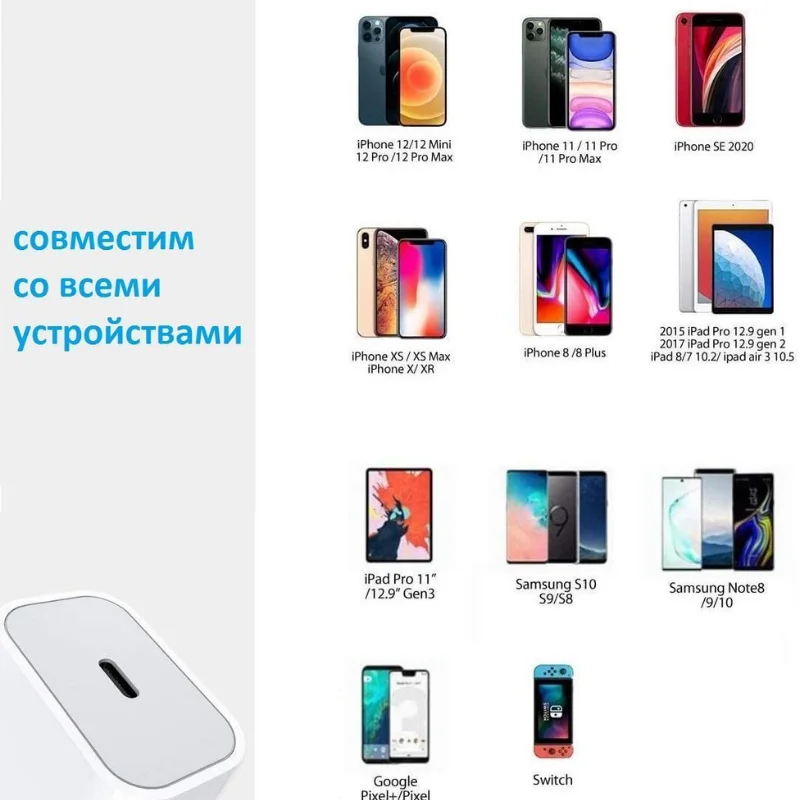 Сетевое зарядное устройство для Apple 20W USB-C Power Adapter совместимо с любыми моделями, в которых есть разъем USB Type-C. Изделие можно использовать с мобильным телефоном iPhone 8 и более поздними версиями смартфонов Apple, а также с планшетными компьютерами iPad Pro и iPad Air. Выходное напряжение модели составляет 20 В, что обеспечивает оптимально быструю зарядку. Изделие работает от стандартной электросети. Модель можно использовать как в домашних условиях, так и на работе, в офисе или во время поездок в автомобиле. Корпус устройства произведен из качественного пластика, который характеризуется долговечностью и высокой стойкостью к механическим повреждениям.iPhone 12 ProiPhone 12 Pro MaxiPhone 12 miniiPhone 12iPhone 11 ProiPhone 11 Pro MaxiPhone 11iPhone SE (2?го поколения)iPhone XSiPhone XS MaxiPhone XRiPhone XiPhone 8iPhone 8 PlusiPad Pro 12,9 дюйма (4?го поколения)iPad Pro 12,9 дюйма (3?го поколения)iPad Pro 12,9 дюйма (2?го поколения)iPad Pro 12,9 дюйма (1?го поколения)iPad Pro