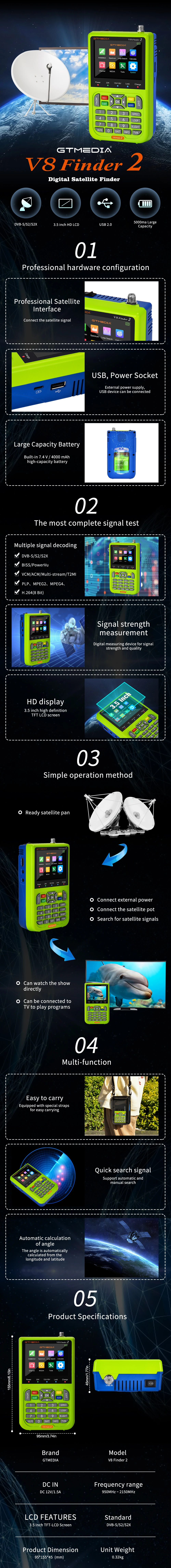GTMEDIA V8 Finder2-это DVB-S/S2 и MPEG-2/4 H.264(8 бит) совместимый портативный спутниковый счетчик. Благодаря компактному размеру, легкому весу, интуитивно понятному интерфейсу пользователя, долгим часам работы батареи и богатым набором функций, счетчик предоставляет все функции, необходимые для установки и проверки цифрового спутникового ТВ-сервиса для жилых домов или многожилых единиц.