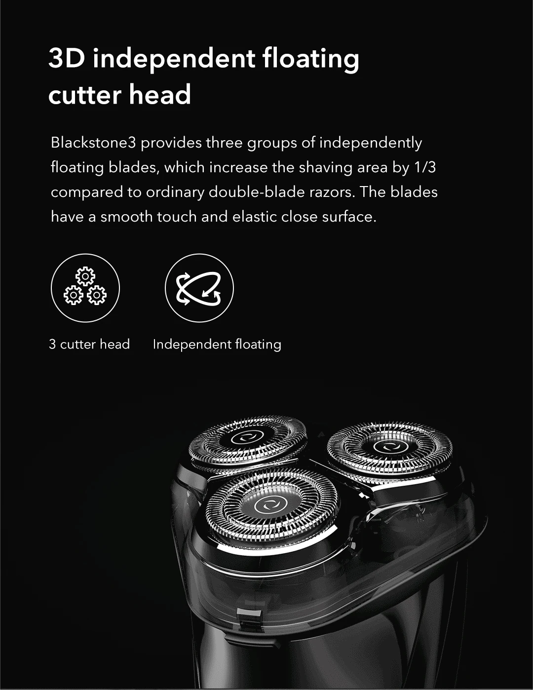 3D Независимая плавающая режущая головкаBlackstone3 предоставляет три группы самостоятельно плавающие лезвия, которая увеличивает область бритья на 1/3 по сравнению с обычными двойного лезвия для бритвы. Лезвия имеют гладкое прикосновение и эластичную закрытую поверхность.