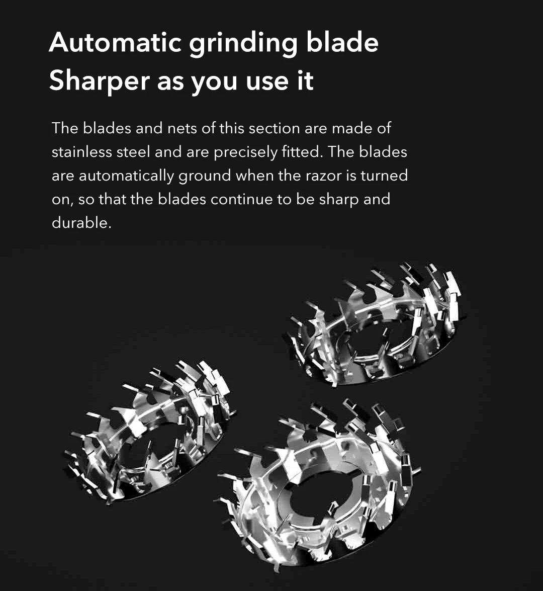 Автоматическое шлифовальное лезвие острее, как вы его используетеЛезвия и сетки этого раздела изготовлены из нержавеющей стали и точно установлены. Лезвия автоматически заземляются, когда бритва включена, так что лезвия по-прежнему острые и прочные.