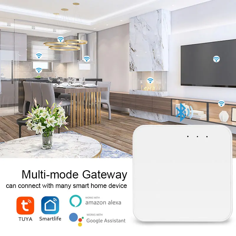 3. Пульт дистанционного управления: удаленно Управляйте устройствами, которые подключены к шлюзу через мобильный телефон через приложение Tuya Smart независимо от того, где вы находитесь, нет необходимости отдельно управлять устройствами Bluetooth и ZigBee в двух разных интерфейсах, просто Управляйте ими в одном одномодовом шлюзе с надежной локальной связью и поддержкой группового управления.