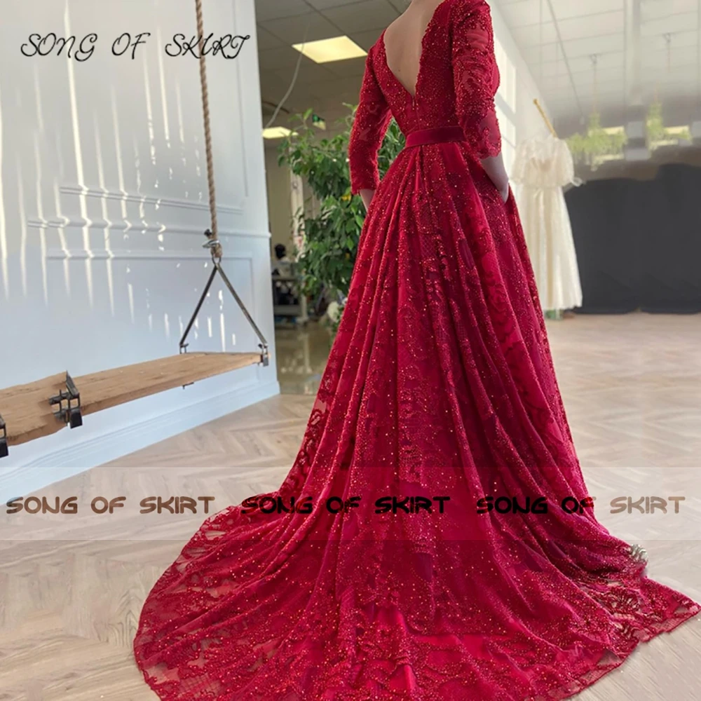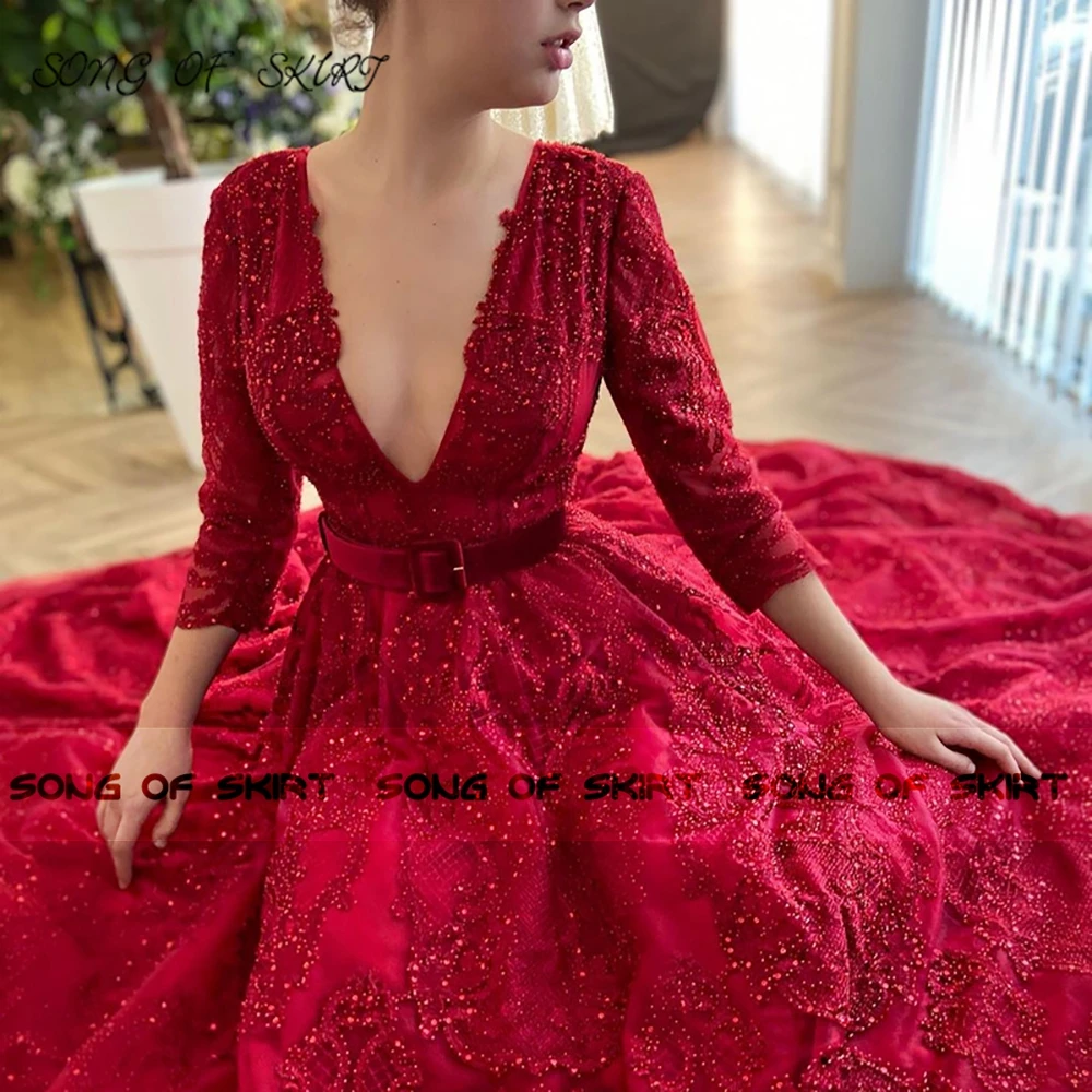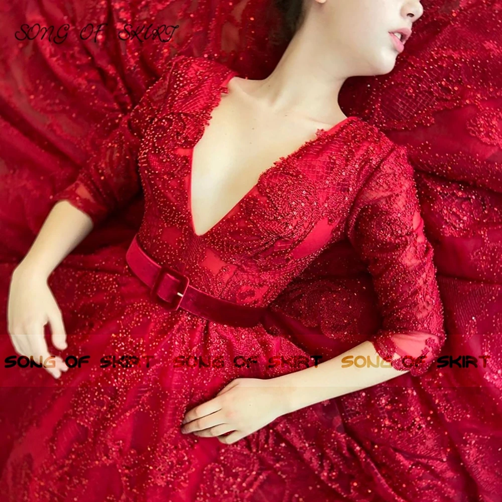 Бордовое вечернее платье с глубоким V-образным вырезом, блестящее женское официальное платье с рукавом три четверти, бальное платье для вечеринки