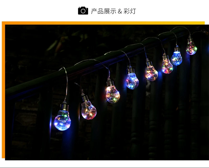 Название: светильник на солнечной батарееЦвет света: белый; Теплый белый; ЦветДлина: 5 мКоличество ламп: 10 лампРазмер лампы: около 6*9 смМатериал лампы: пластикРасчетный срок службы: около 50000 часовРежим: всегда яркий + мигающийЗарядка: Зарядка на солнце около 6-8 часов, ночное освещение около 8-10 часов
