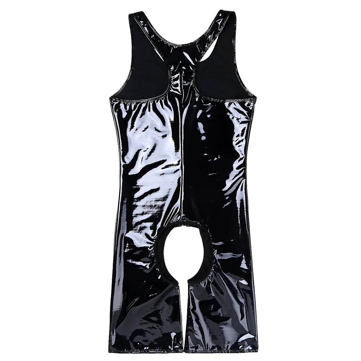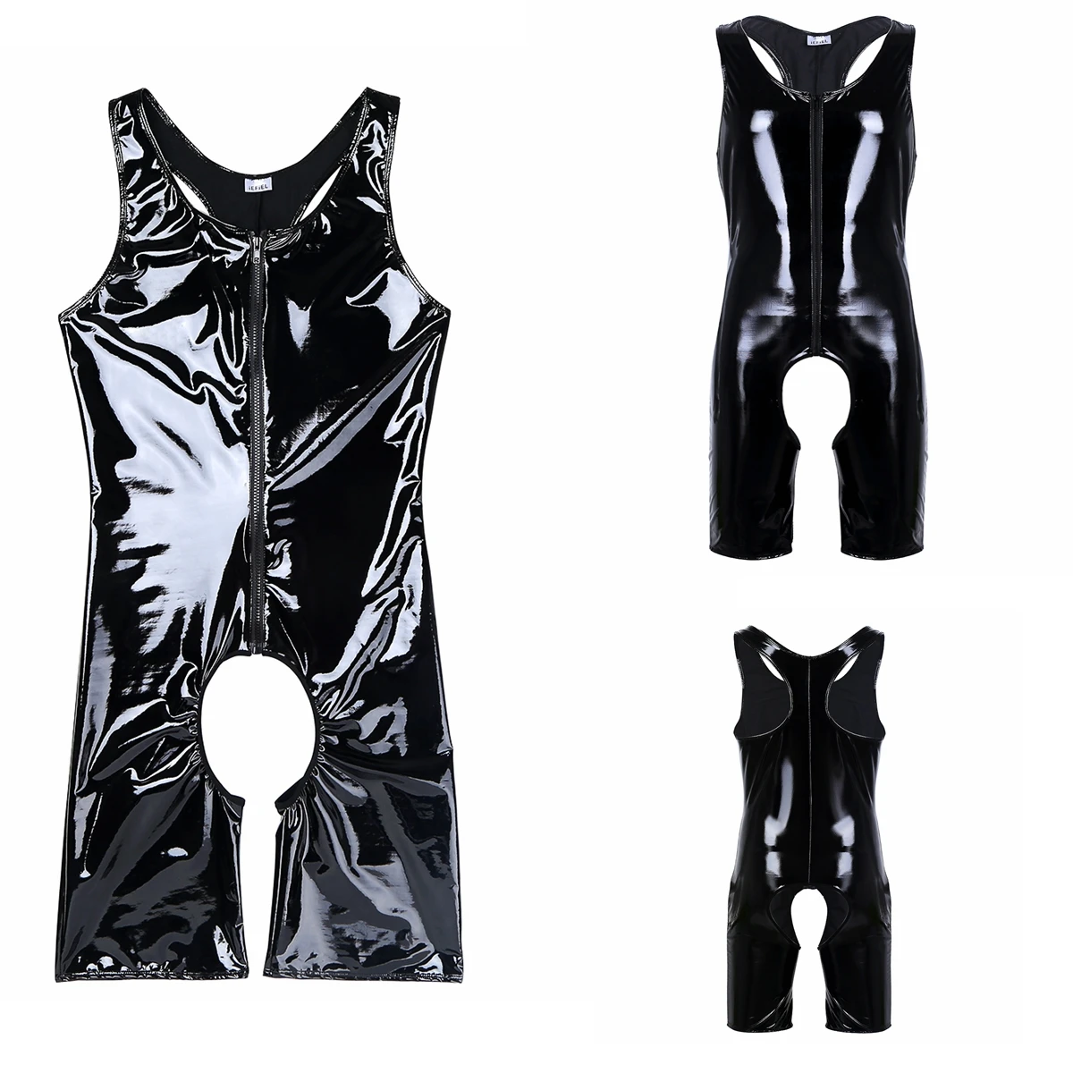 Черные мужские слитные боксеры из лакированной кожи без рукавов с передней молнией и вырезами, нижнее белье