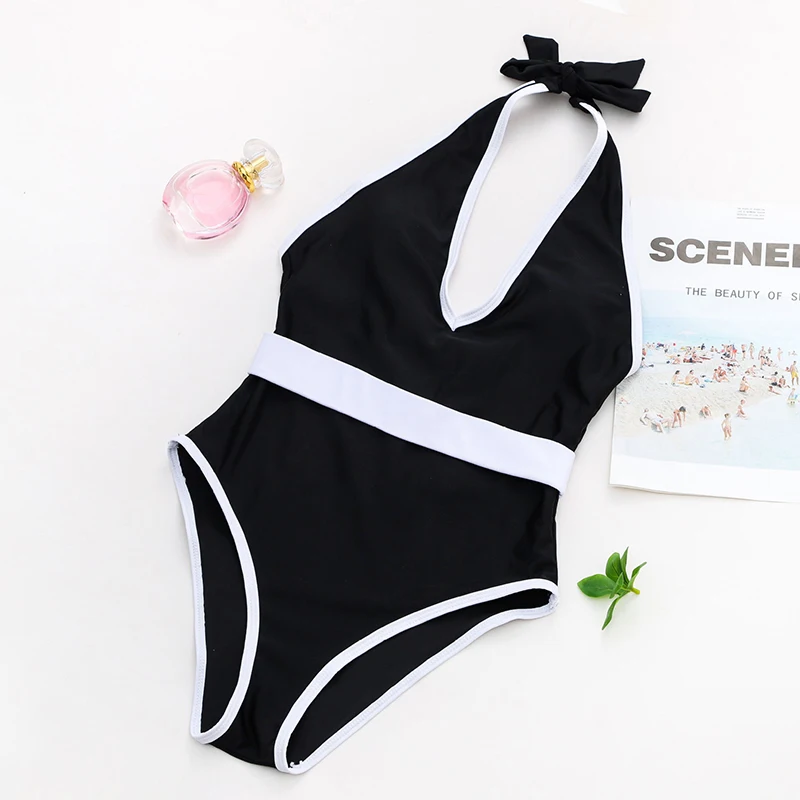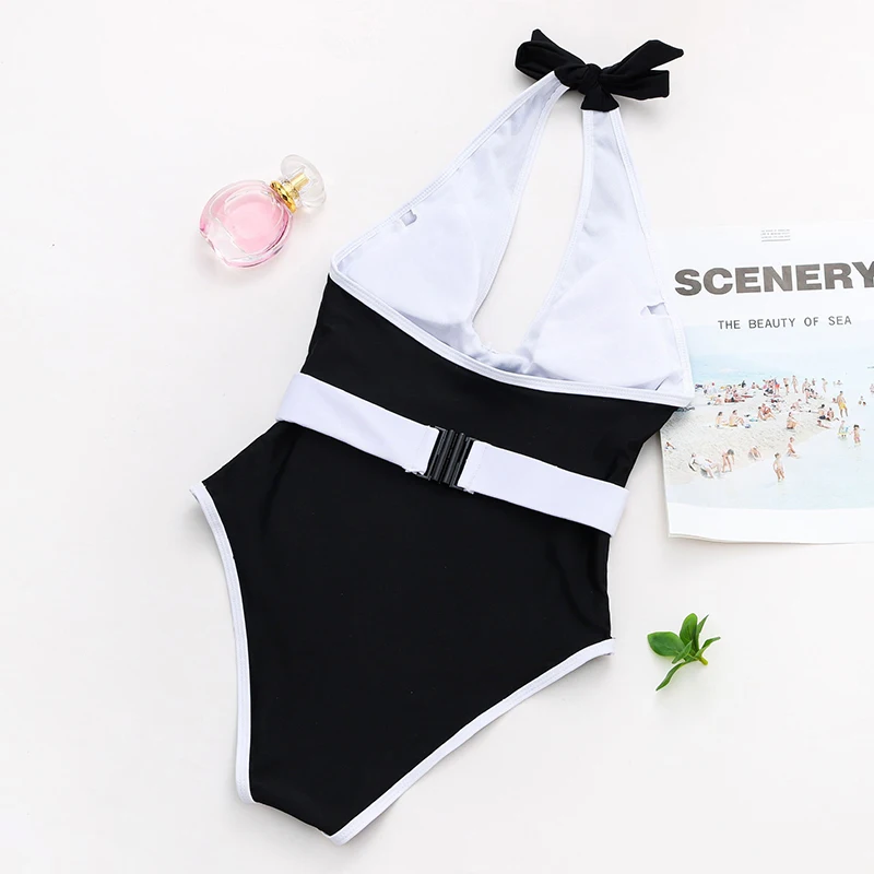 Сексуальный слитный купальник с V-образным вырезом и лямкой на шее для женщин, новый черный с белым поясом, монокини, купальник 2022, купальный костюм с пуш-ап и открытой спиной