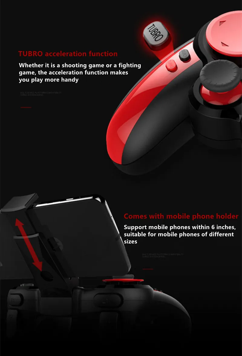 1. Продукт в основном подходит для Android/IOS/Win 7/8/10, подключение по Bluetooth, используется в играх!2. Применимое оборудование: смартфон/планшетный компьютер/смарт-телевизор, приставка/компьютер ПК3. С функцией ускорения Turbo, функция более мощная и быстрая во время игры!4. С телескопической функцией, поддерживает мобильные телефоны в 6,2 дюйма.