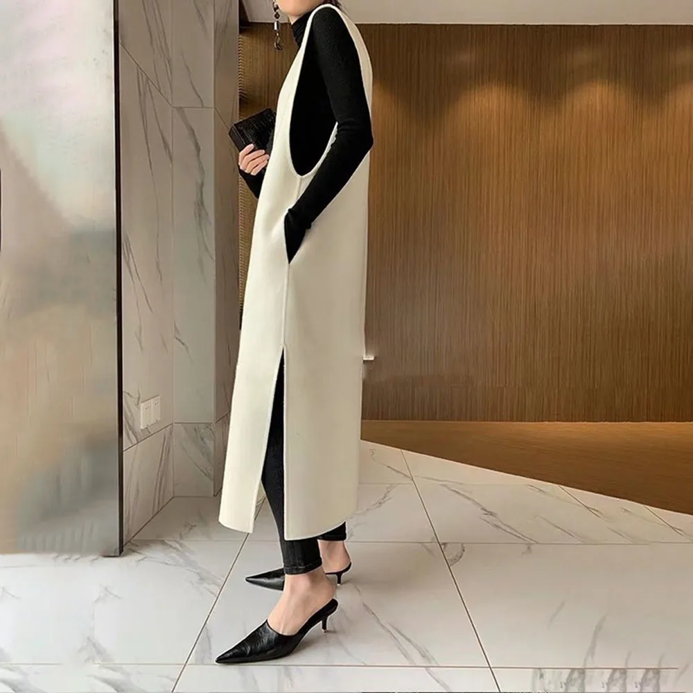 Женское длинное трикотажное платье без рукавов, шерстяной Свободный пуловер с V-образным вырезом и флисовой подкладкой, Осень-зима