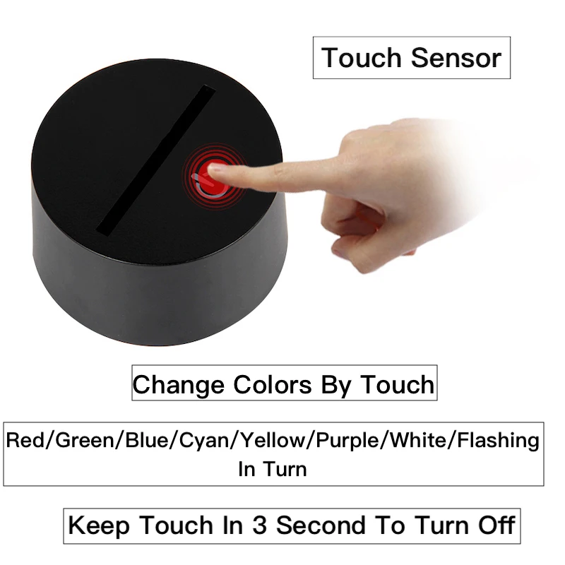 3D светодиодный светильник характеристики:* Обеспечивает более 50000 часов яркого светильник* Включает в себя Энергоэффективный светодиодный светильник (экономия энергии)* Сенсорная кнопка для выключения, включения и изменения видимости цвета.* 7 цветов: белый, красный, зеленый, синий, желтый, голубой и розовый.* Легко включается/выключается удобный выключатель питания на подключенном шнуре* Автоматический режим изменения цвета доступен* Потребляемая мощность: 0012 кВт. Ч/24 часа* Светодиодный срок службы: До 50000 часов* 3D иллюзия пластины толщиной всего 4 мм• Длина кабеля USB: 0,8 м* Вес изделия: 300 г