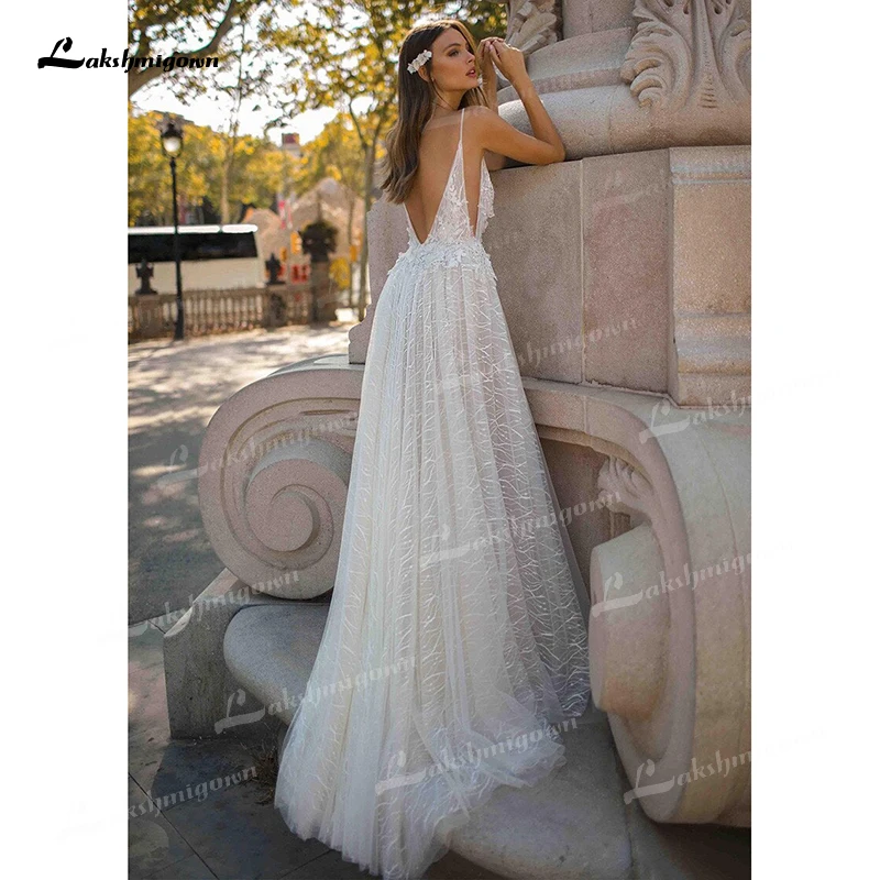 Пикантное свадебное платье-трапеция с высоким разрезом, 2022, блестящие кружевные пляжные платья на бретелях-спагетти для невесты, с открытой спиной, с V-образным вырезом и аппликацией в пол