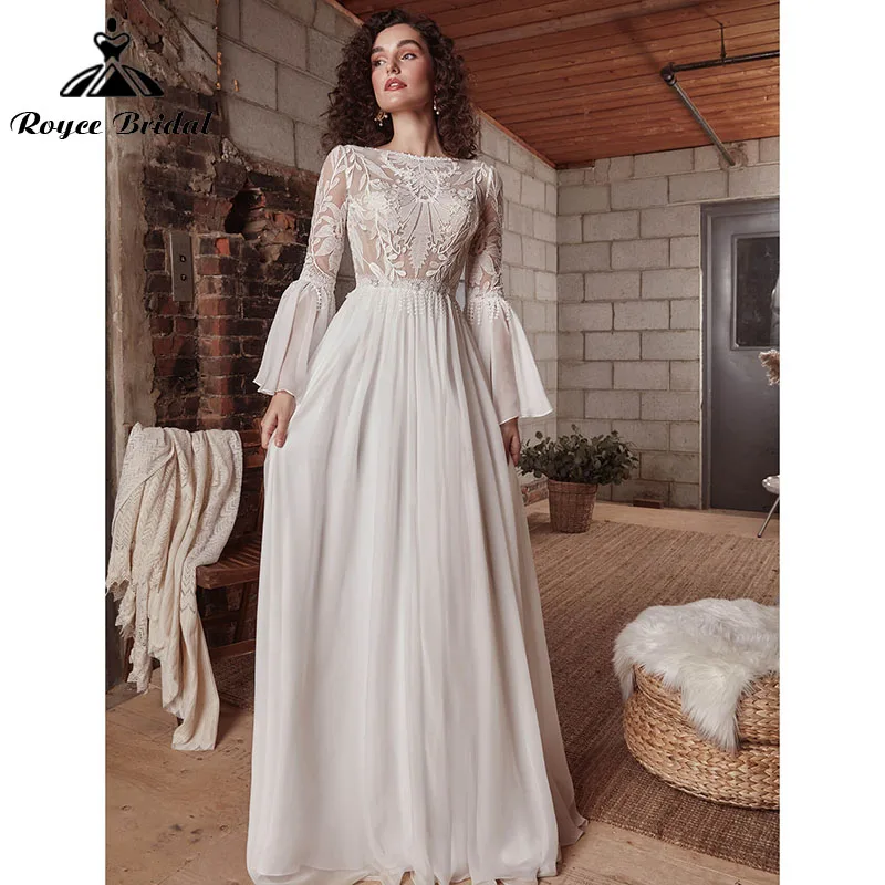 Богемное свадебное платье А-силуэта в стиле бохо, женское пляжное платье с длинными расклешенными рукавами, шлейфом, открытой спиной и круглым вырезом, свадебное платье 2022