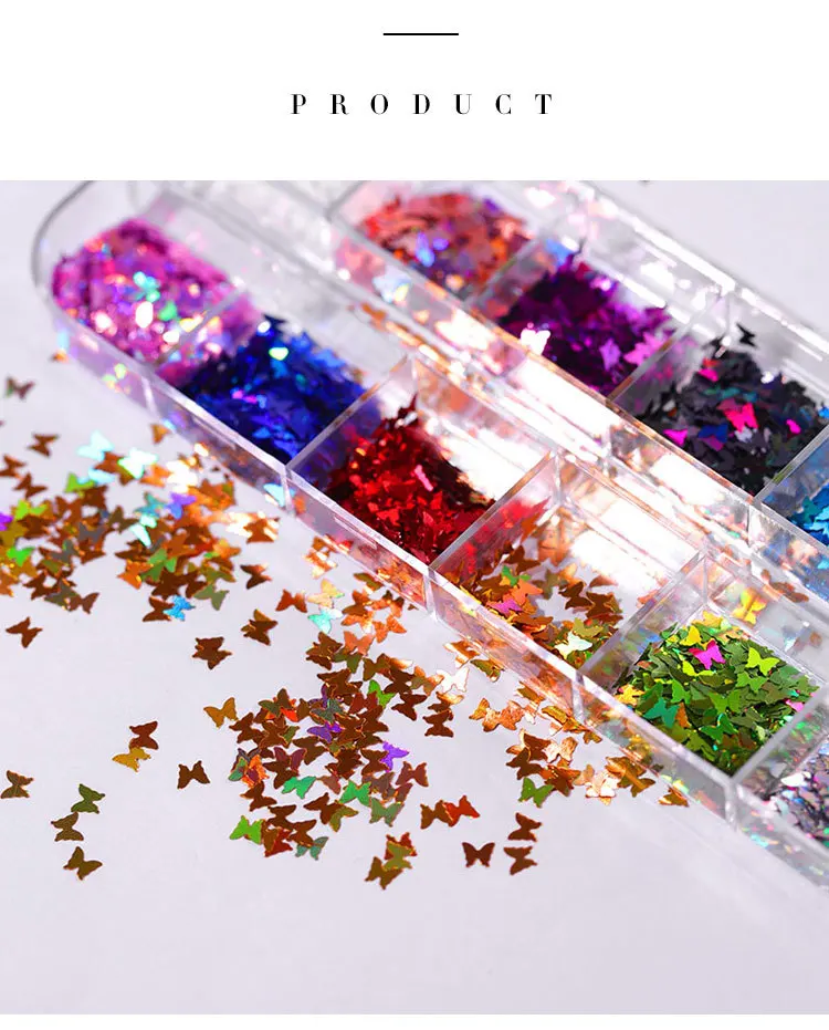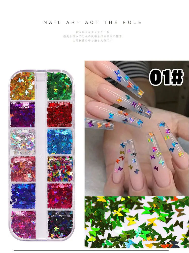 Голографические Блестки для ногтей в виде бабочки, 1 набор, 12 цветов, 3D Блестки для влюбленных, декоративные наклейки для дизайна ногтей, аксессуары для творчества A1