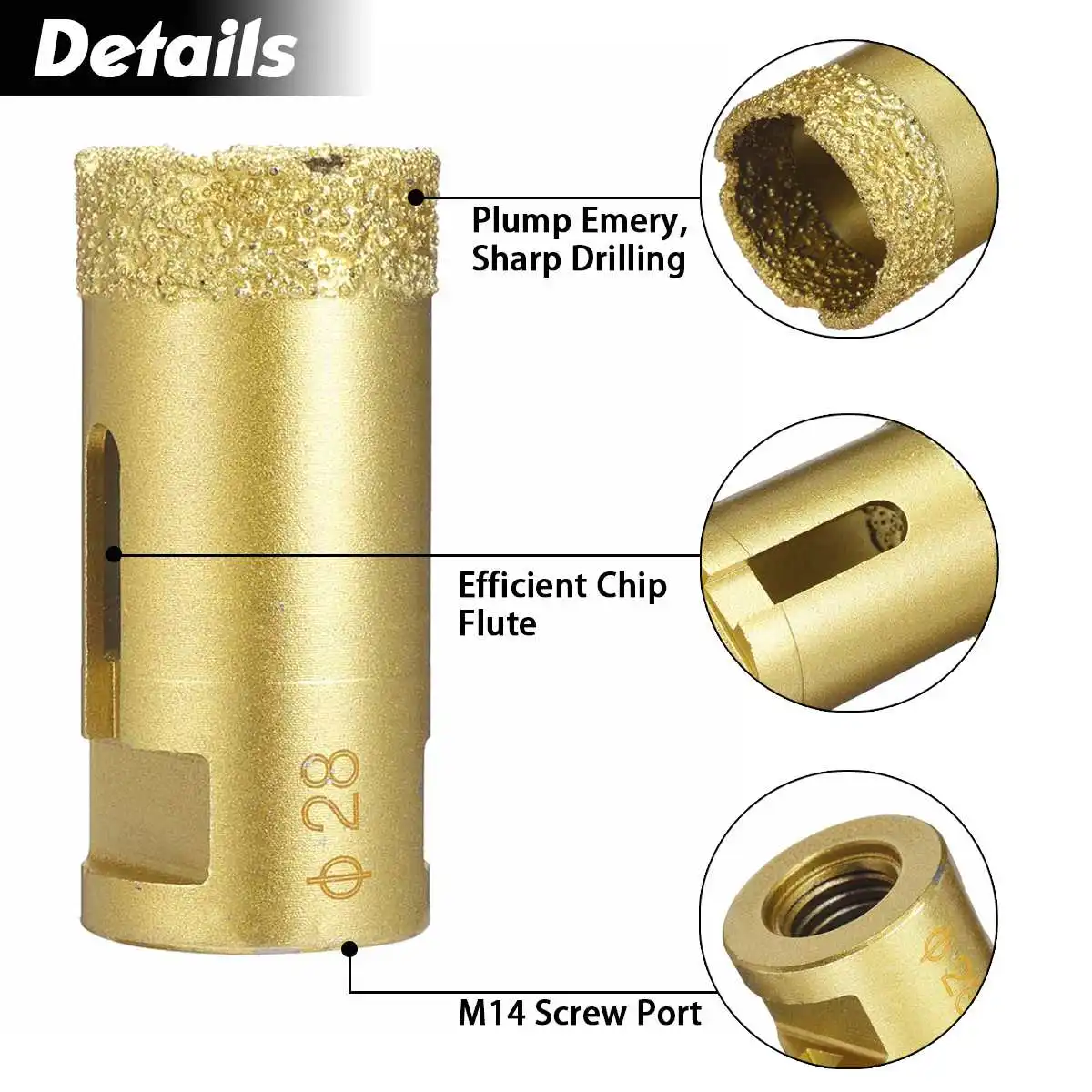 Характеристика: 1. Сухое бурение без подачи воды, 6 мм-35 мм биты с воском внутри помогает охлаждать алмазные сверла коронки.2. Широкое применение для сверления плитки керамического гранитного мрамора ....3. Технология вакуумной пайки приводит к меньшему производству тепла и может выдерживать тяжелую работу.4. Может быть использован при более высокой температуре для сверления через твердую фарфоровую плитку, керамику, мрамор и шифер с легкостью;5. Лучшее качество отделки, например, сверление чистых и точных отверстий.
