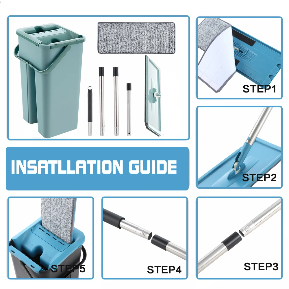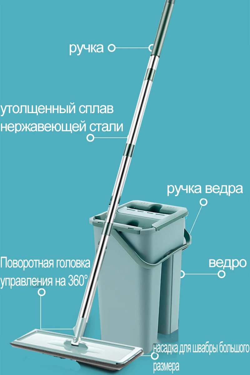 Функция: Влажная/сухая чисткаРазмер: как показано на картинке, они одинакового размера.Материал: пластик и нержавеющая стальПосылка включает в себя: 1 комплект (4 шт. тряпка для швабры + 1 насадка для швабры + 1 ведро)