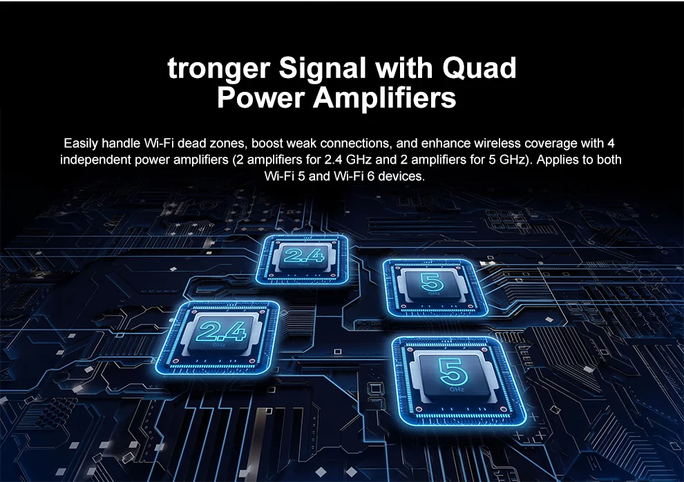 Легко отрегулировать мертвые зоны Wi-Fi, boost слабые соединения, а также повысить беспроводное покрытие с 4 независимых усилители мощности (2 усилитель для 2,4 ГГц и 2 усилители для беспроводной Wi-Fi 5 ГГц). Подходит для устройств Wi-Fi 5 и Wi-Fi 6.