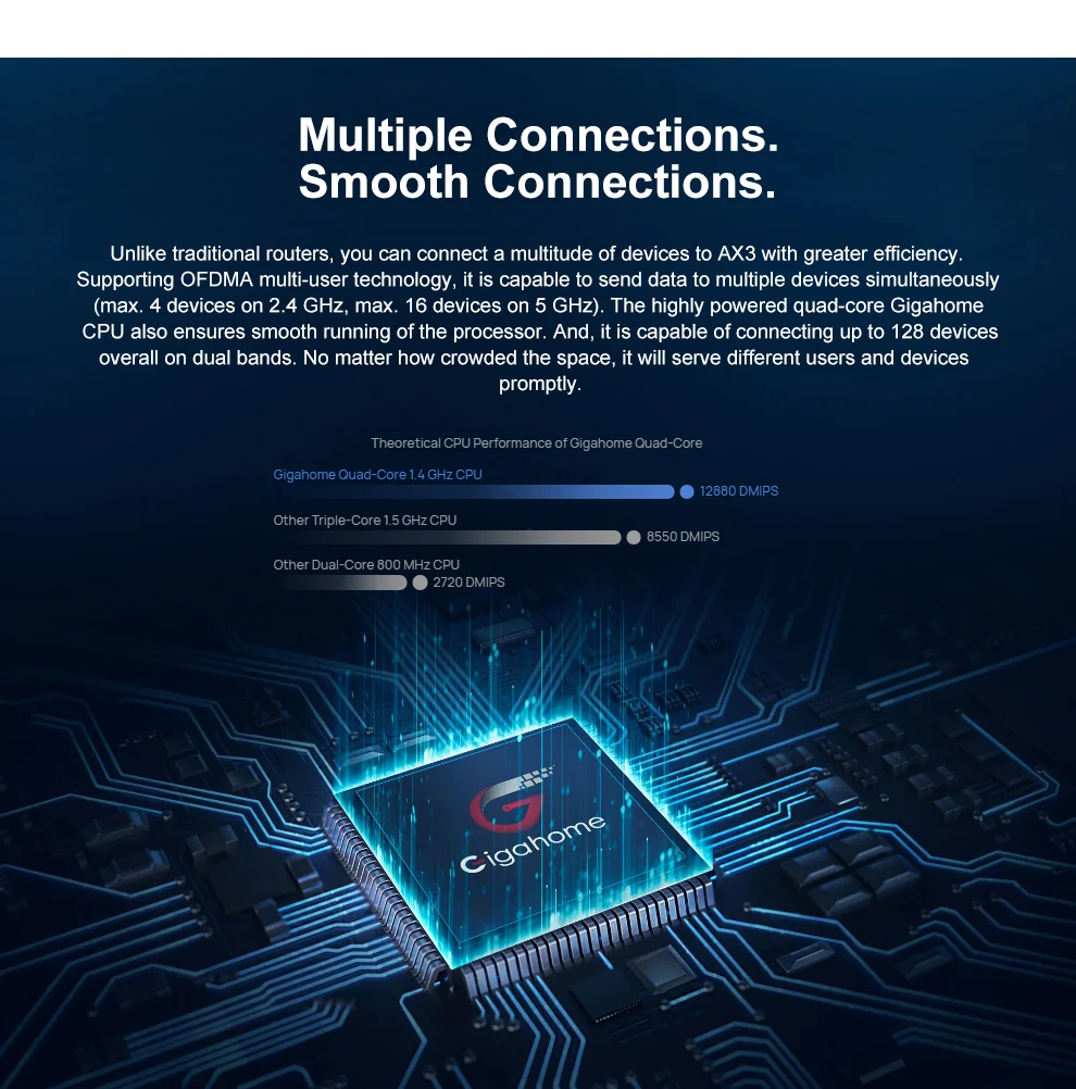 В отличие от традиционных маршрутизаторов, вы можете подключить множество устройств к AX3 с большей эффективностью. Поддержка OFDMA просмотра несколькими пользователями (технология, оно способно передавать данные к нескольким устройствам одновременно (max.4 устройств на 2,4 ГГц, max.16 устройств по Wi-Fi 5 ГГц). В высшей степени Четырехъядерный процессор Gigahome также обеспечивает плавную работу процессора. И. Он способен подключать до 128 устройств в целом на двух диапазонах. Независимо от того, насколько много места. Он будет служить различным пользователям и устройствам Быстро.