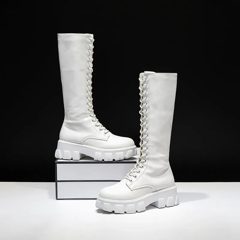 Женские высокие ботинки из ПУ кожи, на шнуровке, до середины икры
