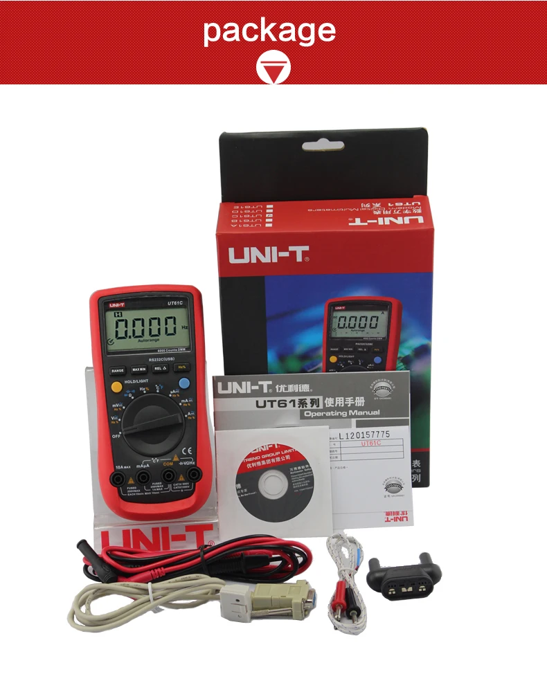Технические характеристики Диапазон UT61C Напряжение постоянного тока (В) 1000 в ±(0.5% + 1) Напряжение переменного тока (В) 750 В ±(1% + 3) Постоянный ток (A) 10A ±(1% + 3) Переменный ток (A) 10A ±(1.2% + 5) Сопротивление (Ω) 60 МОм ±(1% + 2) Емкость (F) 4000μF ±(3% + 5) Частота (Гц) 10 Гц ~ 10 МГц ±(0.1% + 4) Температура -40 °C ~ 1000 °C ±(1.2% + 3) -40 °F ~ 1832 °F ±(1.2% + 4) Особенности Счетчик дисплея 6000 Полоса пропускания (Гц) 45 Гц ~ 1 кГц Рабочий цикл 0.1% ~ 99.9% √ Общие характеристики Мощность 9В батареи (6F22) Дисплей 65 мм x 43 мм Цвет изделия Красный и серый Вес нетто продукта 370 г Размер изделия 180 мм x 87 мм x 47 мм Стандартные аксессуары Батарея, Тестовые провода, многоцелевая розетка, RS-232 кабель интерфейса, ПК программное обеспечение CD, датчик температуры контакта Стандартная индивидуальная упаковка Подарочная коробка, руководство на английском языке Стандартное количество в коробке 22 шт. Стандартное измерение коробки 455 мм x 335 мм x 375 мм Стандартная коробка Вес брутто 13 кг Дополнительный аксессуар Кабель интерфейса USBОбратите внимание: батарея не включена! Возврат и возврат Если есть какие-то проблемы с нашей продукцией, мы поддерживаем обмен, возврат или возврат, но, пожалуйста, свяжитесь с нами и предоставьте четкое видео. Все возвращенные товары должны быть в оригинальной упаковке, и вы должны предоставить нам номер отслеживания доставки, конкретную причину возврата. У вас есть 7 дней, чтобы связаться с нами и 30 дней, чтобы вернуть его с даты получения. Если этот товар находится в вашем распоряжении более 7 дней, он считается использованным, и мы не выдадим вам возврат или замену. Исключений нет! Стоимость доставки зависит от пошлины. Детали доставки Товары доставляются из Китая, посылка занимает около 3 рабочих дней, а доставка за границу-10 ~ 45 дней. Если ваша посылка влюблена в злую погоду или на карнавал, пожалуйста, терпеливо подождите. Так как все продукты доставляются самолетом, которые не могут нести батарею, вы должны купить общую батарею самостоятельно. Если вы хотите выбрать другой способ доставки, такой как DHL UPSS и т. д., пожалуйста, свяжитесь с нами, прежде чем сделать заказ