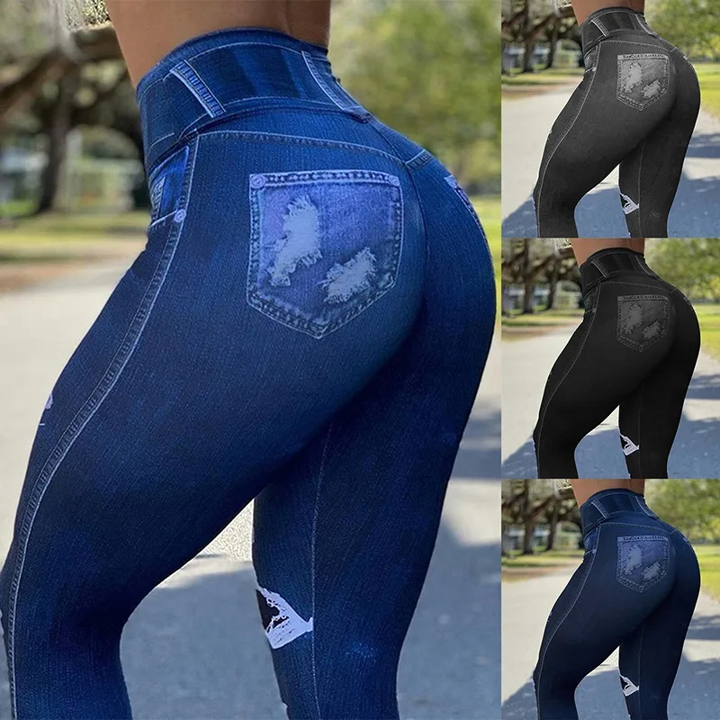 Сексуальные эластичные леггинсы с имитацией джинсов, штаны с высокой талией для фитнеса, облегающие леггинсы для женщин 2021, спортивные Леггинсы с эффектом пуш-ап для женщин, Лидер продаж
