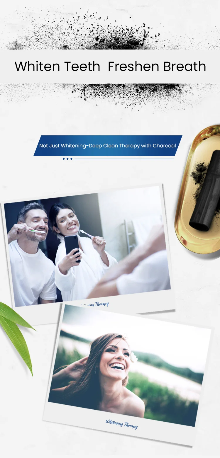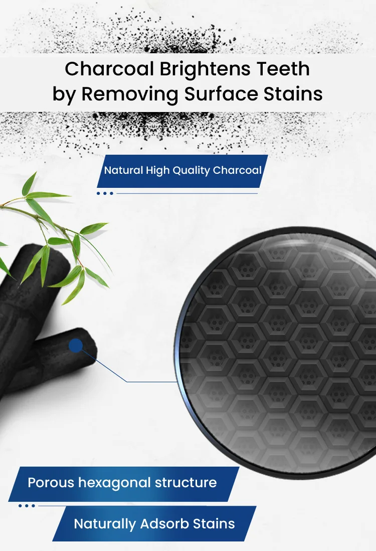 1. Формула с древесным углем осветляет зубы, удаляя пятна на поверхности