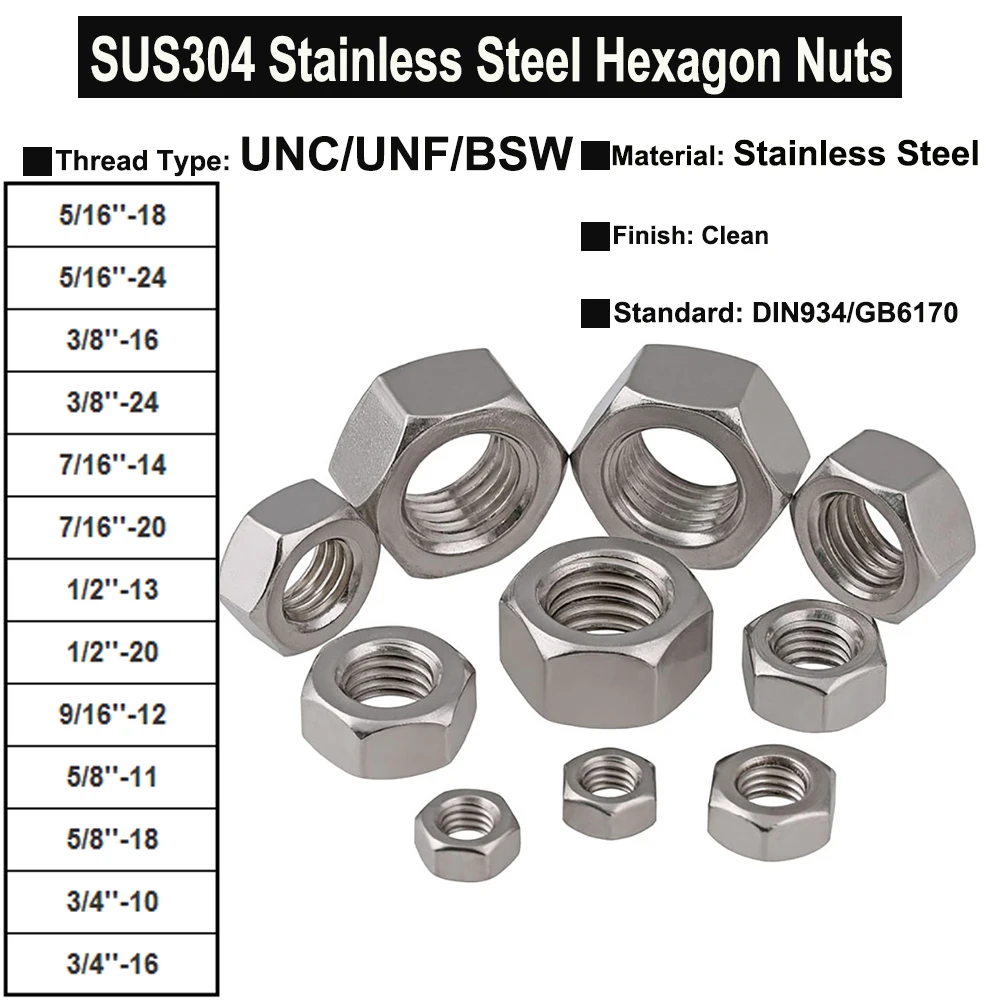 Шестигранные гайки из нержавеющей стали DIN934 GB6170, 1 шт., 10 шт., 516 дюйма, 38 дюйма, 716 дюйма, 12 дюйма, 916 дюйма, 58 дюйма, 34 дюйма, UNCUNFBSW, резьба SUS304