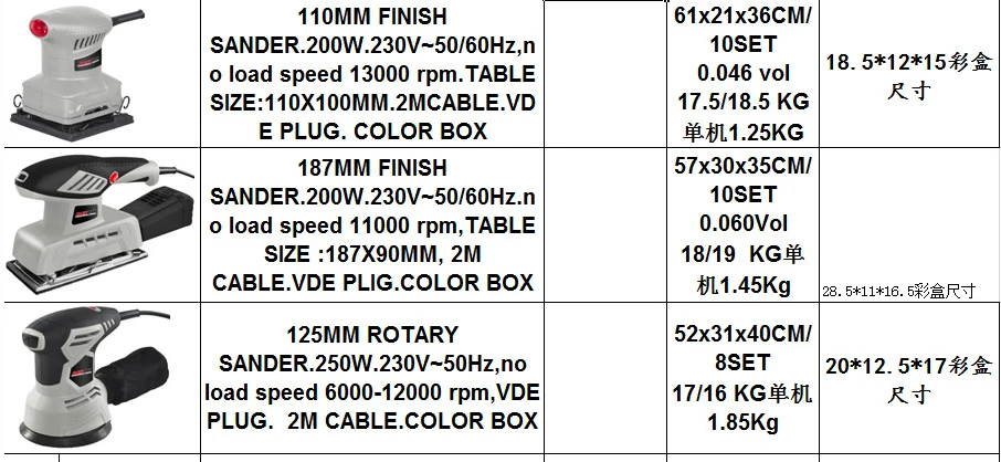 Спецификация: Материал корпуса : Пластик Узоры : Круглый, квадратный Штепсельная Вилка : Штепсельная вилка европейского стандарта (мы будем основываться на вашей стране, чтобы отправить соответствующий Штепсель адаптера) -Круглая машина Двигатель : 220 В, 50 Гц, 240 Вт Без скорости нагрузки : 12000 об/мин Размер подкладки : 125 мм Бумажный Тип : Крюк и петля Длина шнура : 6 футов Лоток для наждачной бумаги : Самоклеющиеся Вакуум : Наличие вакуумного мешка -Квадратная машина Двигатель: 220 В, 50 Гц, 200 Вт Без скорости нагрузки: 13500р/мин Размер подкладки: 110x100 мм Длина шнура: 6 футов Лоток для наждачной бумаги: зажатый Вакуум: без вакуумной функции Особенности: Компактный размер, прост в эксплуатации. Мощный двигатель, более эффективный, сильный теплоотвод Нижний самоклеящийся диск для замены песочной бумаги легко Резиновая ручка, удобная, эффективно уменьшает вибрацию во время использования Многоцелевой шлифовальный станок для дерева, полировка шпатлевки, шлифование металла, шлифовка мебели, шлифовка краски или поверхности стен Упаковка включает: 1 X шлифовальная машина 1 х Кабель питания 1 X Руководство пользователя Примечание: -Возможны незначительные отклонения в размерах из-за ручного измерения. -Пожалуйста, учитывайте фактические размеры в списке, так как изображения обычно увеличиваются, чтобы показать детали. -Из-за различных партий продукции детали продукта могут немного отличаться. Если вы хотите узнать разницу, пожалуйста, покупайте внимательно. -Из-за светильник экране монитора фактический цвет, цвет товара может быть s светильник ly отличается из-за характеристик монитора компьютера. Спасибо за понимание.