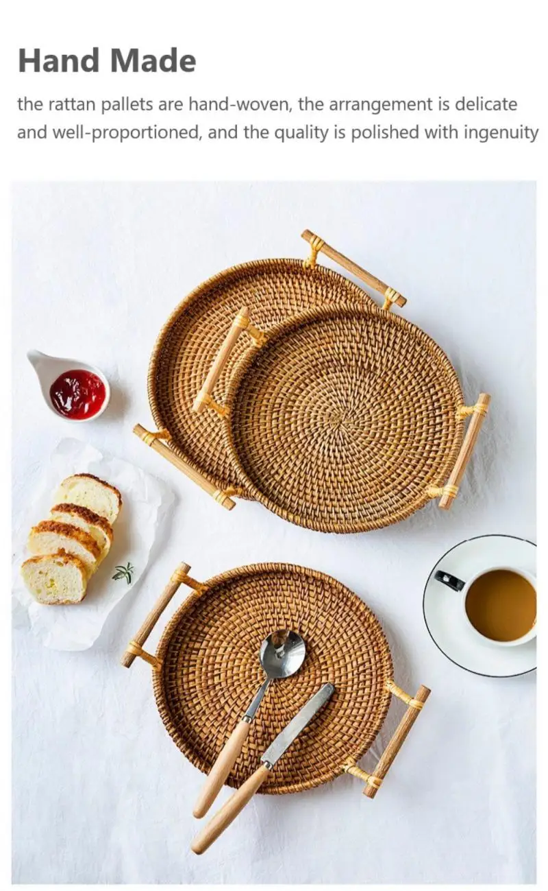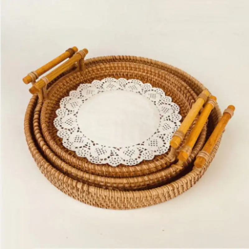 Круглый ротанговый поднос ручной работы с деревянной ручкой, тарелка для хлеба, закусок, тарелка для фруктов, тортов, поднос для хранения фруктов и еды, поднос для чашки, корзина