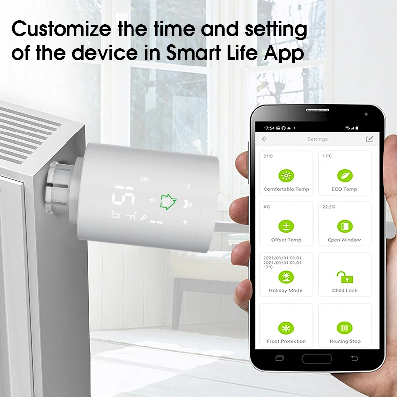 Клапан термостатического радиатора (TRV)-это саморегулирующийся клапан, устанавливаемый на радиатор системы отопления горячей воды, чтобы контролировать температуру комнаты, изменяя поток горячей воды на радиатор. С помощью TRV TV02 вы можете удобно регулировать температуру в помещении от 5 до 30 ℃ и экономить более 15% энергии.