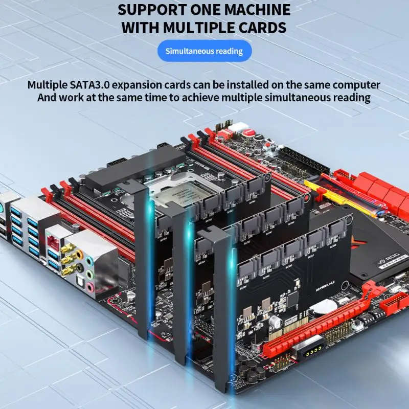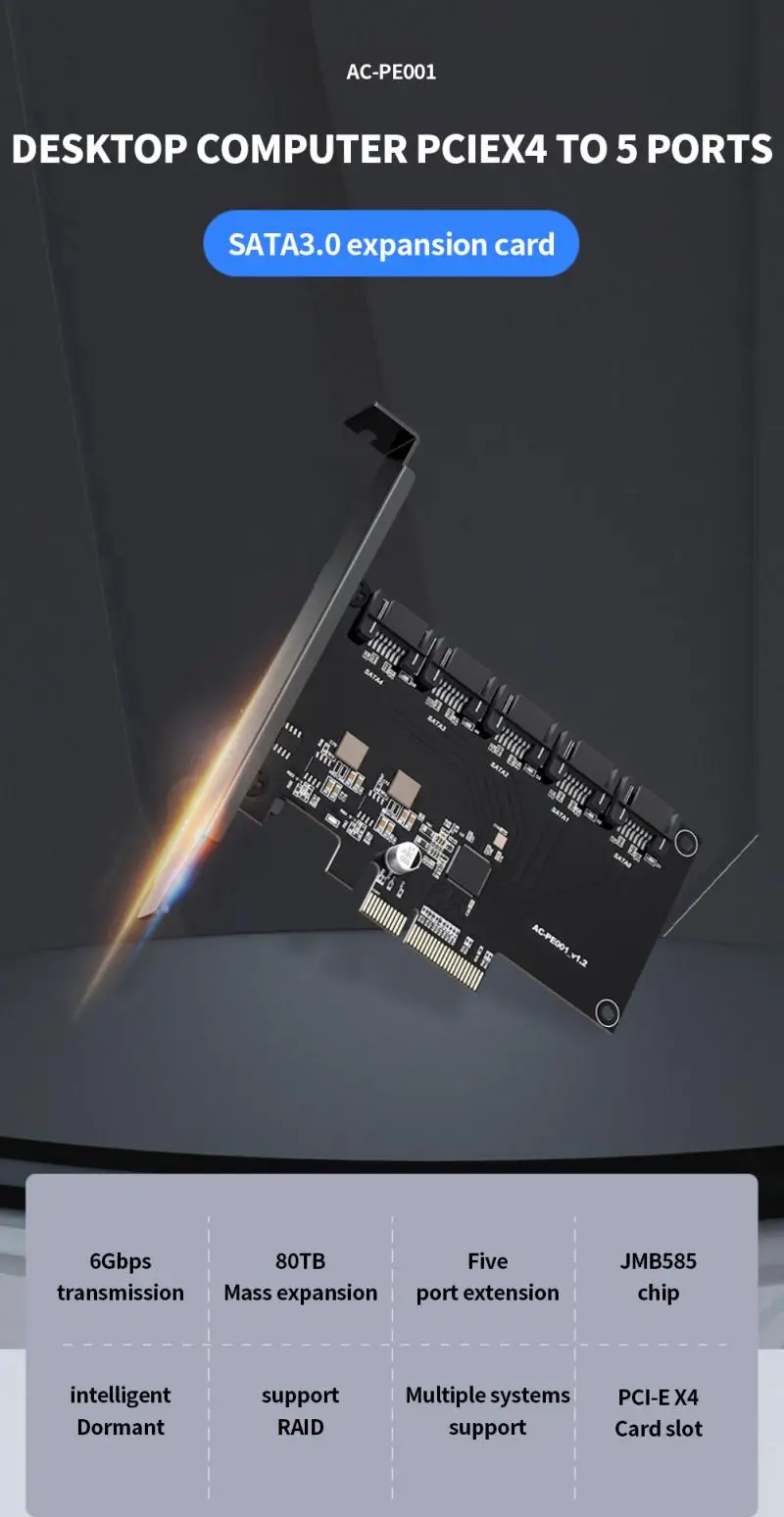 1. Оснащен 5 интерфейсами SATA3.0, в соответствии со спецификацией PCI-E2.0, поддерживает 5 жестких дисков SATA, а скорость передачи данных может достигать 6 Гбит/с.