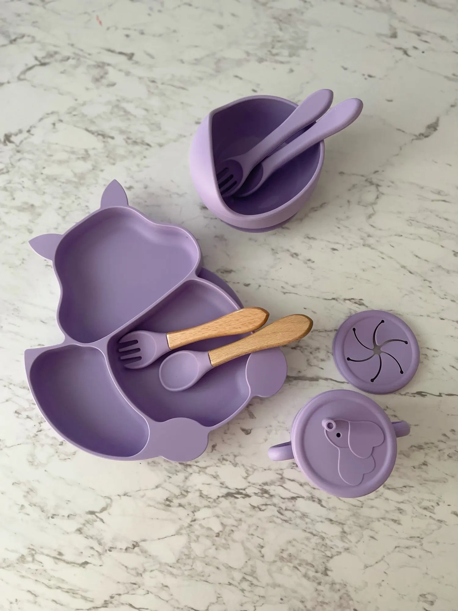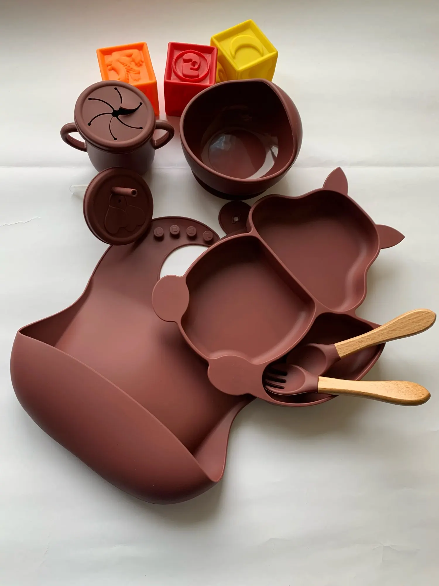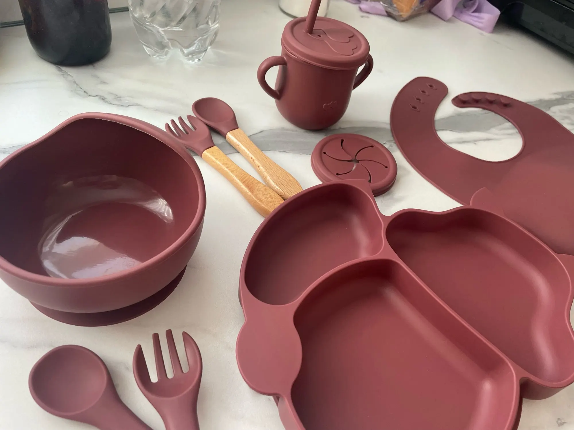 Посуда супер. качественный силикон. Очень приятный цвет.